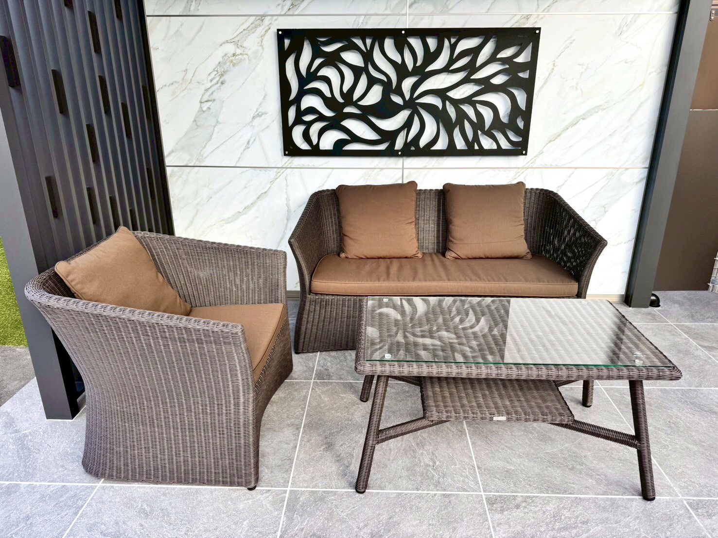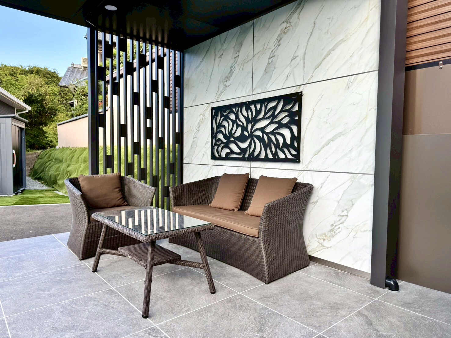 壁面には大理石のようなアリストンマーブルを貼り、タカショー デザインパネルⅡ ユーカリを取り付けました。格子はタカショー アクセントパネル バロック マットブラック。シックなガーデンファニチャーが良く合います。