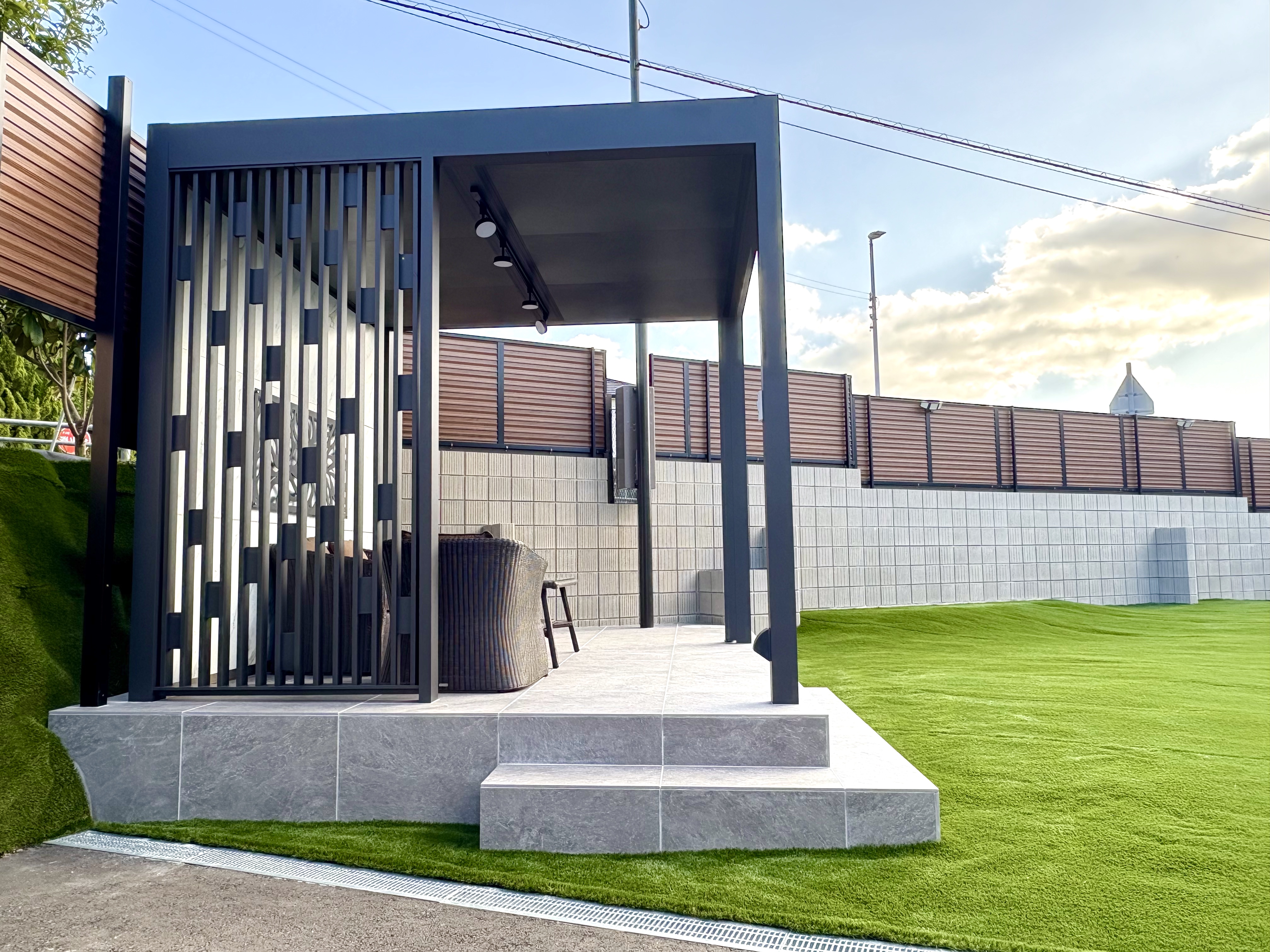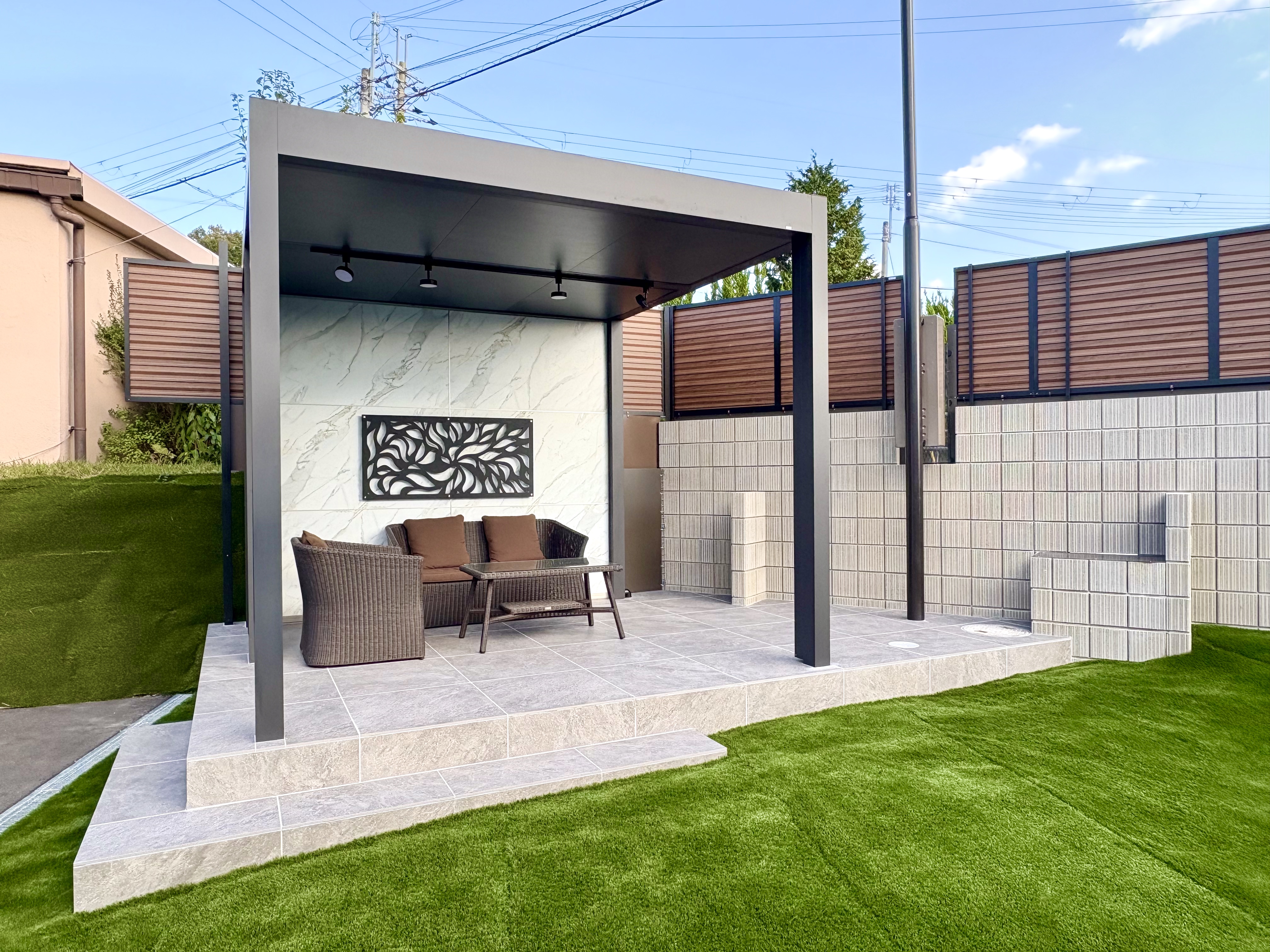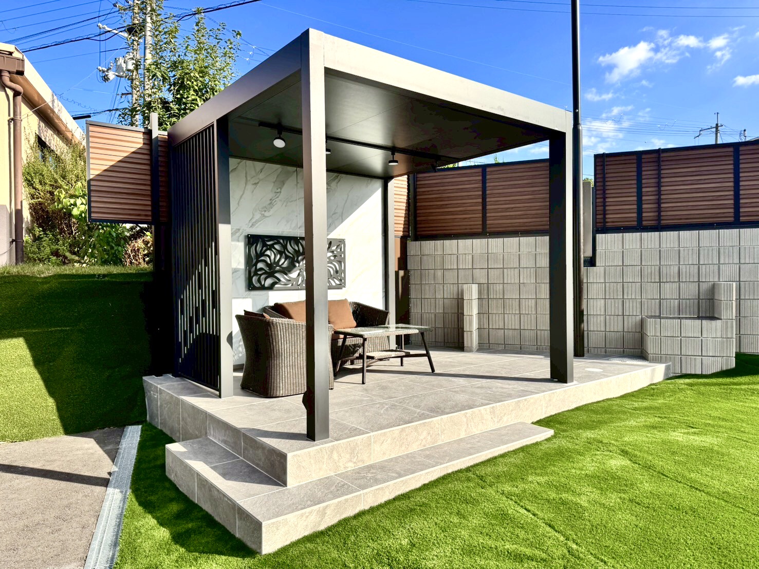 広いお庭にホームヤードルーフが似合う、プライベートガーデンが完成しました。