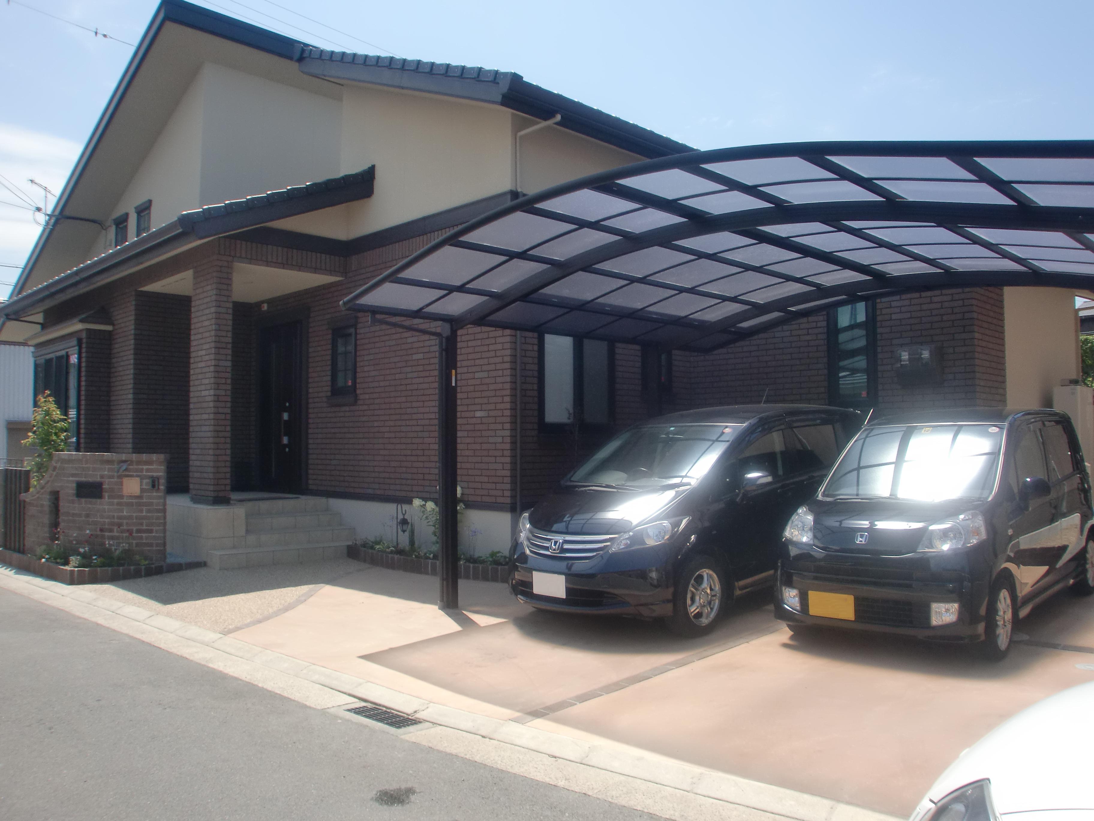 静かな住宅街にある高砂市のM様邸。建物がこだわったおしゃれな印象なので、外構もデザイン性と使い勝手を重視して設計しました。駐車場はカラーコンクリートで舗装し、2台用のカーポートを。門柱はレンガで造り、ポーチの両側には花壇を設けています。裏側の駐車場にはオーバードアを取り付け、クローズにしています。ブラウンを基調とした重厚感がある外構に仕上がりました。