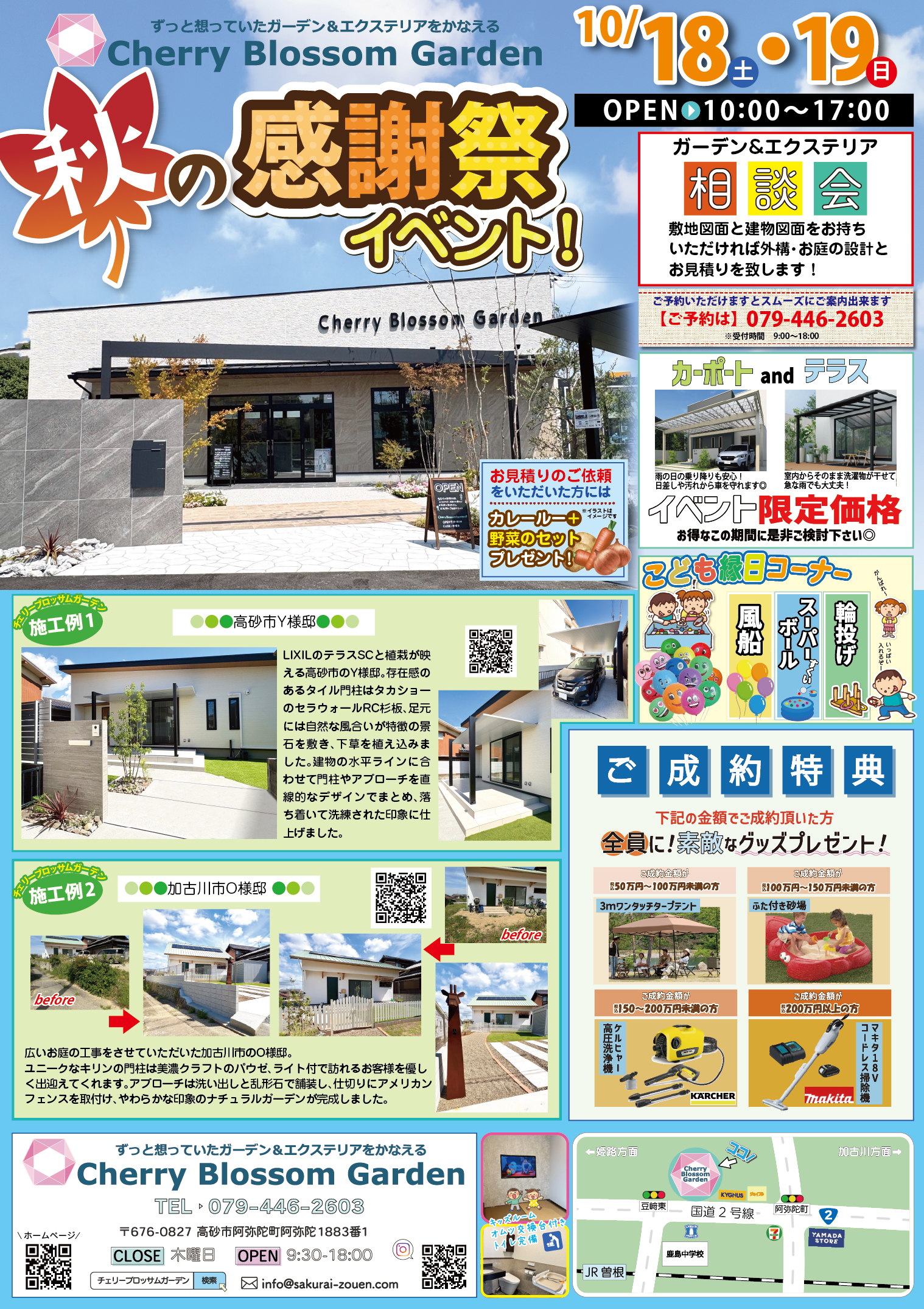 10月18日㈯・19日㈰の2日間、チェリーブロッサムガーデン新店舗にて「秋の感謝祭イベント」を開催致します。