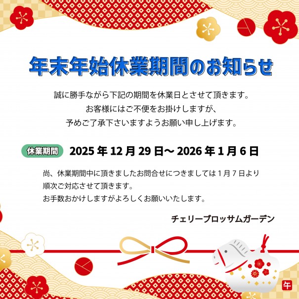 【年末年始休業のお知らせ】 いつもご愛顧を賜り、誠にありがとうございます。年末年始は、12月29日㈪~1月6日㈫の間、休ませていただきます。新年は7日㈬より通常通り営業致します。2026年もチェリーブロッサムガーデンをどうぞ宜しくお願い申し上げます。