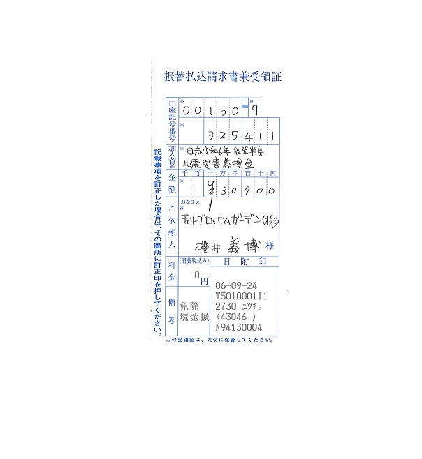 相談会での人工芝の売上¥30,900円を、9/24日付けで日本赤十字社に寄付させていただきましたので、ご報告致します。