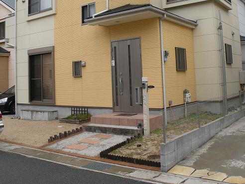 門周りが機能柱だけで寂しい感じなのと、アプローチ・階段がコンクリートなので、