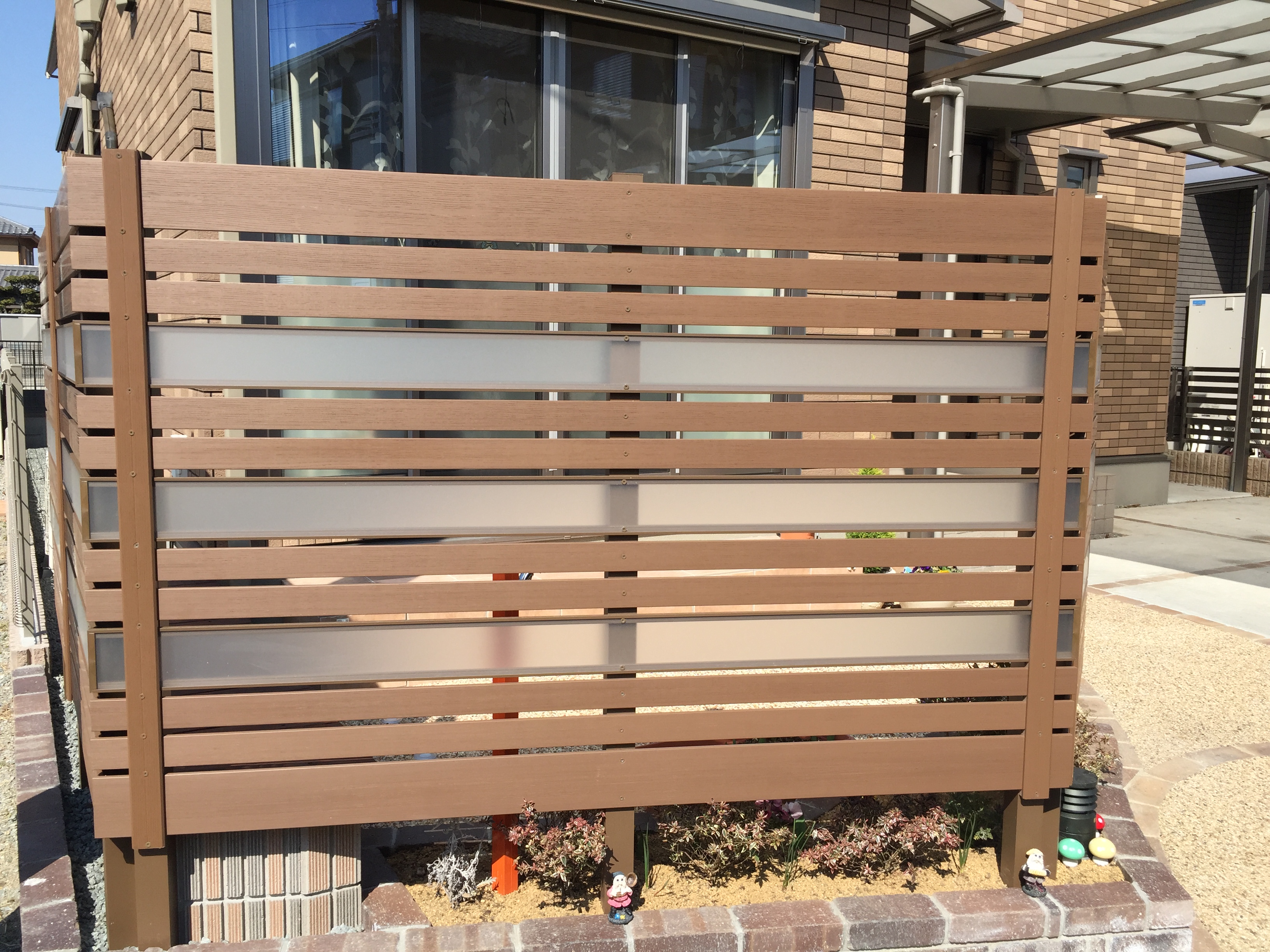 加古川市のK様邸、お庭とテラスの工事をさせていただきました。目隠しのフェンスはディーズガーデンのアルファウッド。高さ1.7mと高めなので、圧迫感が出ないようポリカパネルを入れたり、板の幅を2種類入れたりと、リズミカルな雰囲気に仕上げました。