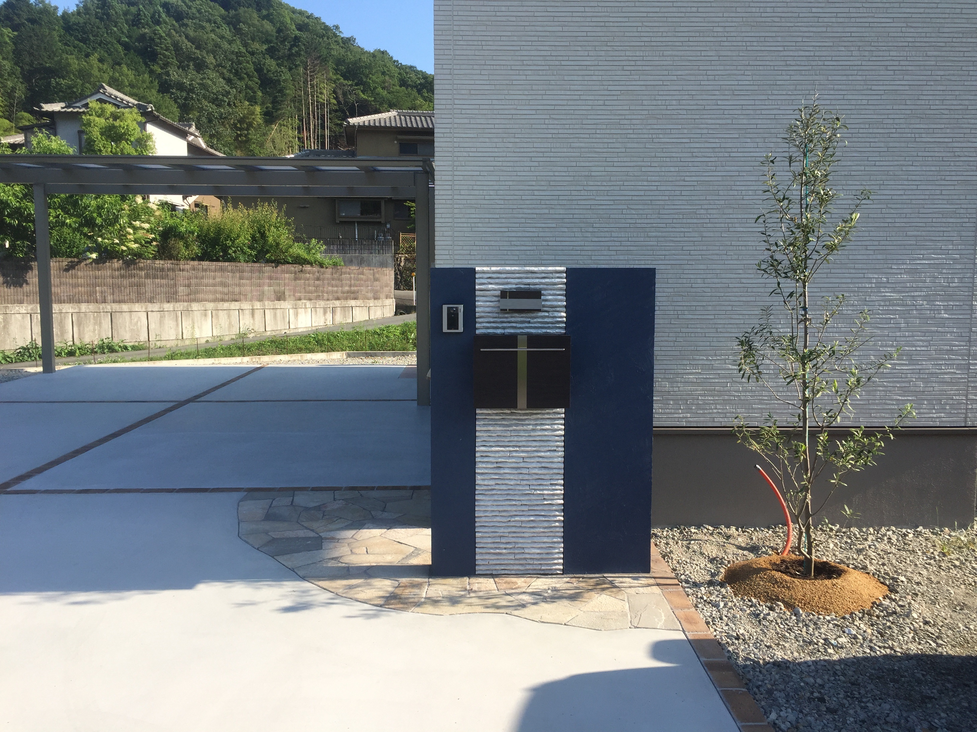 姫路市のK様邸、新築工事をさせていただきました。スタイリッシュな門柱はジョリパット塗装とパイルストーンで。天然石ならではの存在感で、お家の外壁ともよく調和しています。横にはシンボルツリーのオリーブを植え、紺色の門柱に緑がよく映えています。