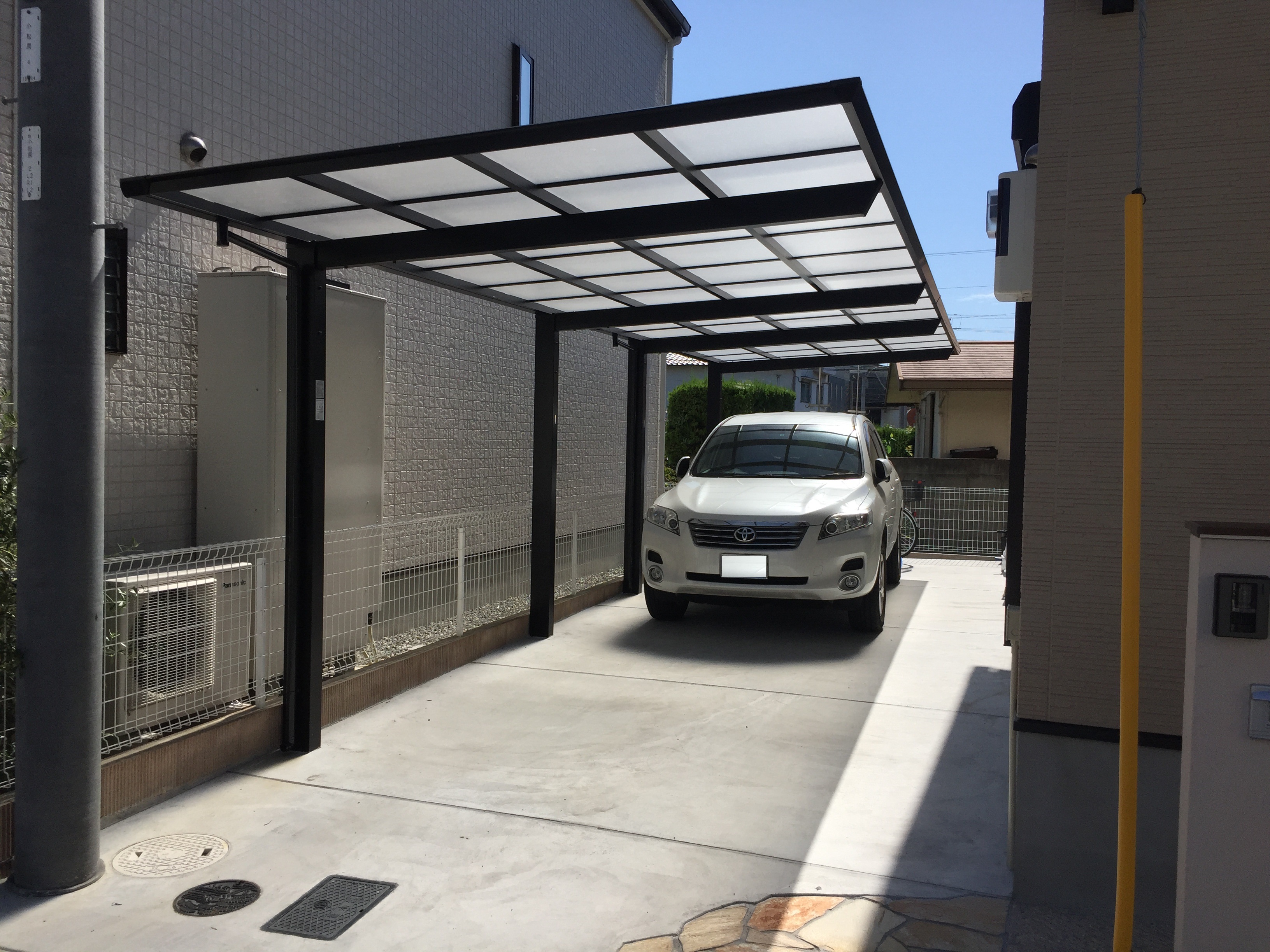 高砂市のO様邸、新築工事をさせていただきました。縦連棟のカーポートは三協のセルフィ。シャープでスタイリッシュなハイデザインが特徴です。車の後ろには自転車をとめて、有効に活用しています。土間部分はコンクリートで舗装し、手前側にはアクセントで乱形石を入れました。