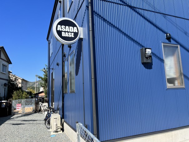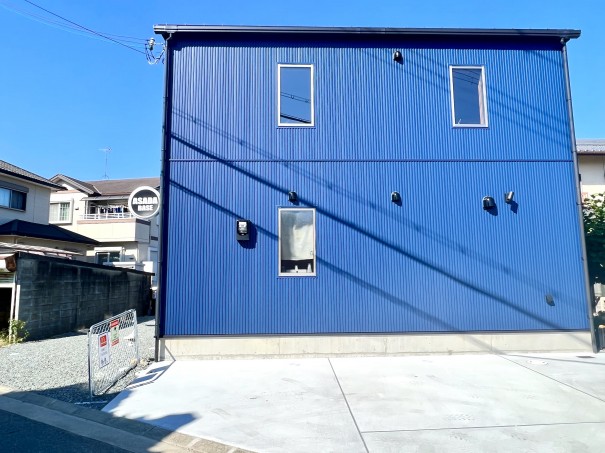 ブルーの外観にオリジナルのサインが映え、毎日の生活を楽しむA様ファミリーのライフスタイルを感じます。
