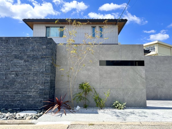幅2.4m高さ1.7mの広い門柱の表面は、オオムラ エコストーン・グレーを張り、名古屋モザイク・ニューセンチュリー タイルをアクセントとして使用、重厚感に高級感をプラスしました。