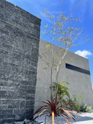 門柱前の植栽には、アオダモを中心に、マホニアコンフーサ・コルジリネ・ウエストリンギア・グレビレアを植えました。
