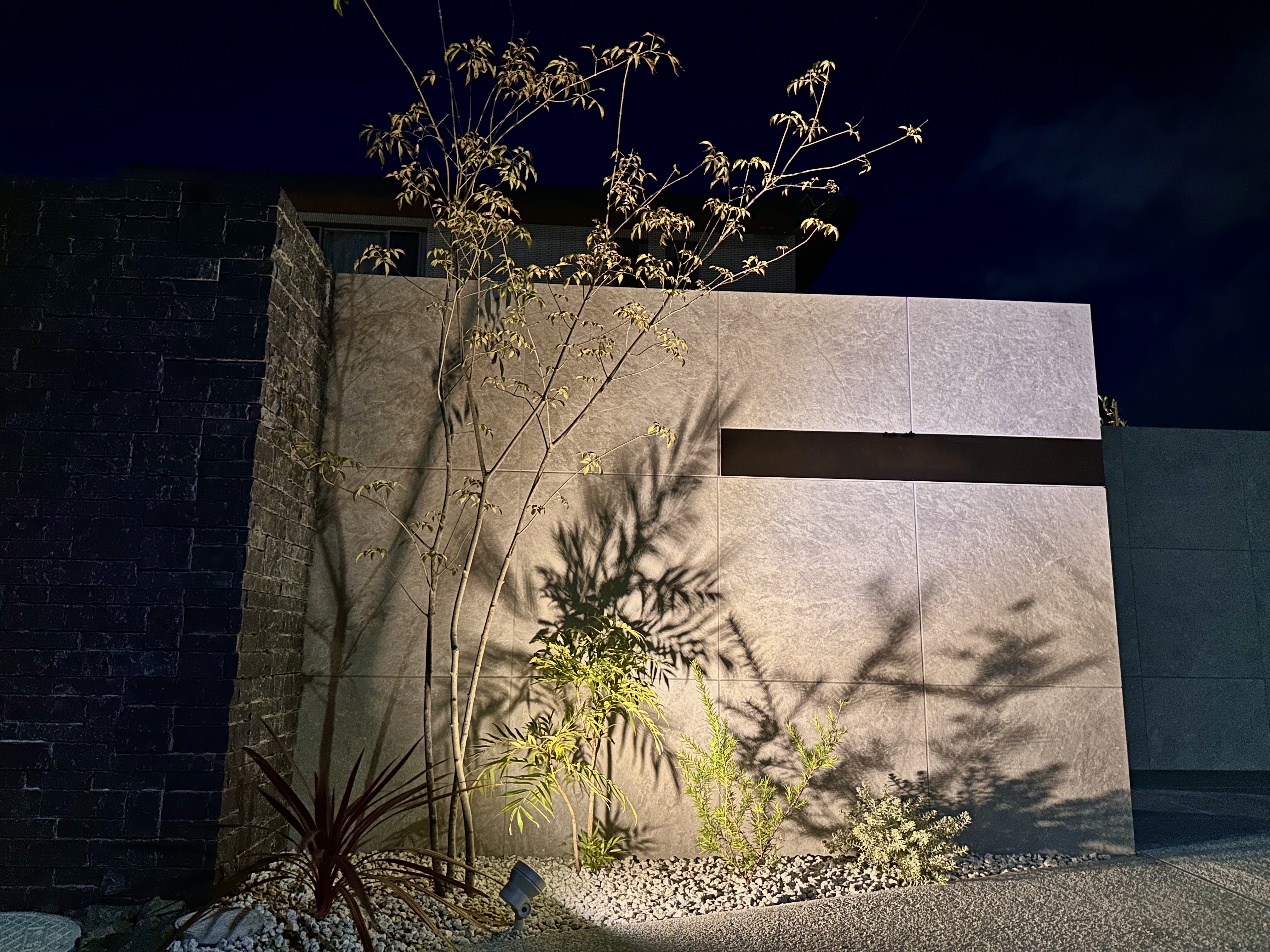 効果的なライティングで、夜は違った表情を楽しめ、防犯効果も。毎日の暮らしを心豊かに過ごしていただけるお庭が出来上がりました。