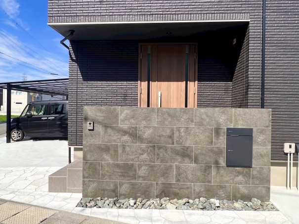 幅広で印象的な門柱は、玄関周りの目隠しの役割も兼ねています。表面には、タカショーのタイル セラレバンテ・ブラックを使用しシックに。門柱の前面の足元にはグレイッシュストーンを敷き詰め、ガーデンアップライトを設置し、夜には違った表情を醸し出します。宅配ポストは、ユニソン ヴィコDB100 マットブラックで落ち着いた感じに。アプローチ部分の乱形石はクレモナストーン・ナチュラルホワイトを使用しました。
