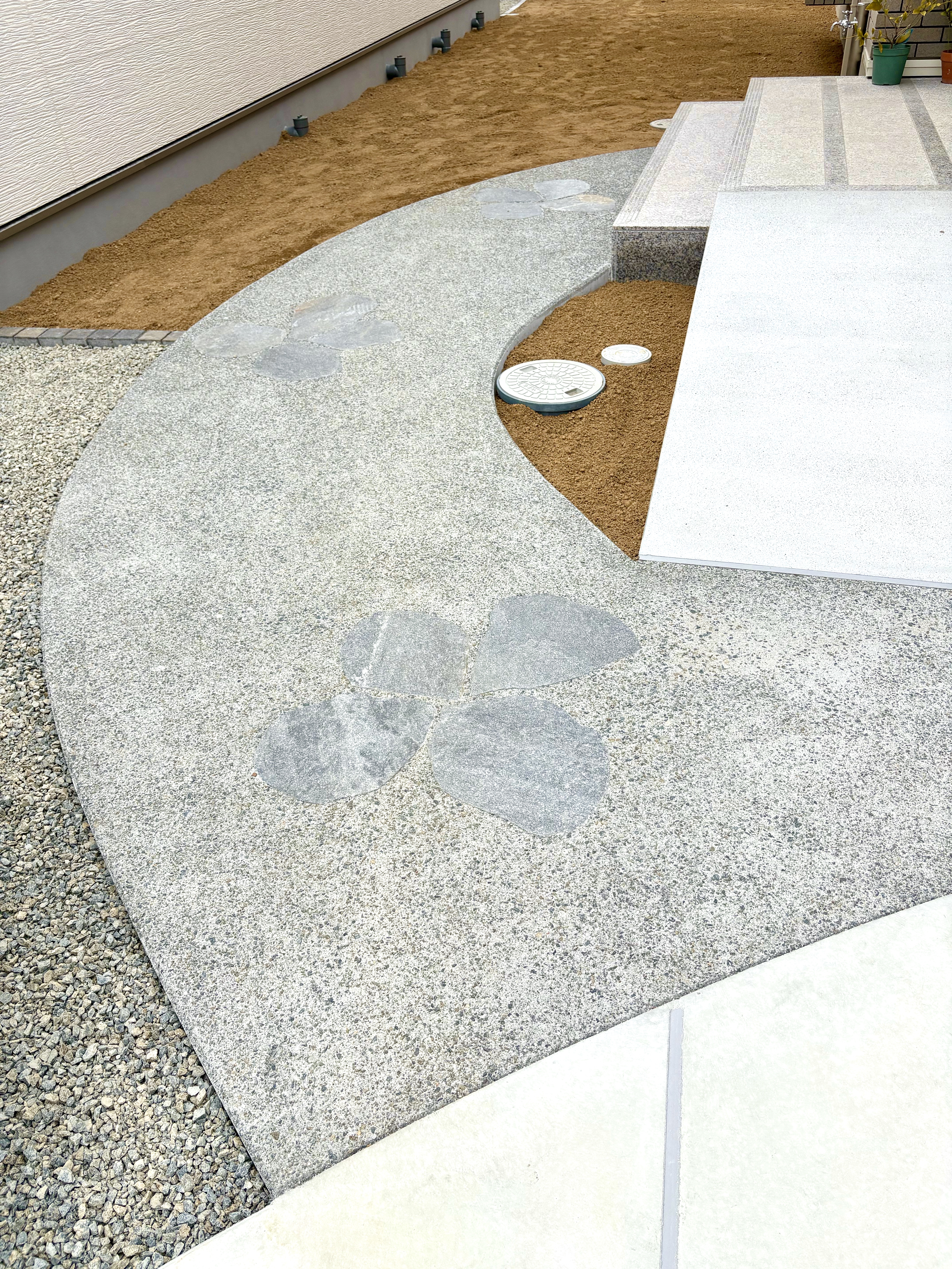 2wayのアプローチ、片方のコンクリート洗い出しのアプローチには、アクセントとして乱形石でお花の模様を3ヶ所施しました。もう一方のスロープは、滑らないよう刷毛引き仕上げにしています。