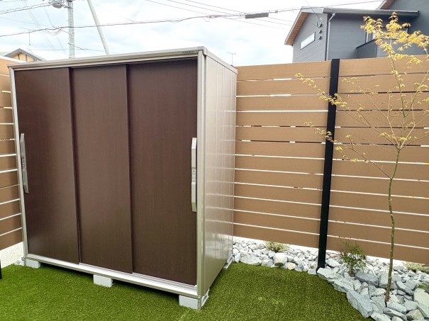 物置はヨドのエスモ ESF-1909A。目隠しフェンスに高さがあるため、外からは物置が見えず生活感を感じさせません。