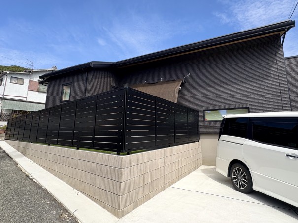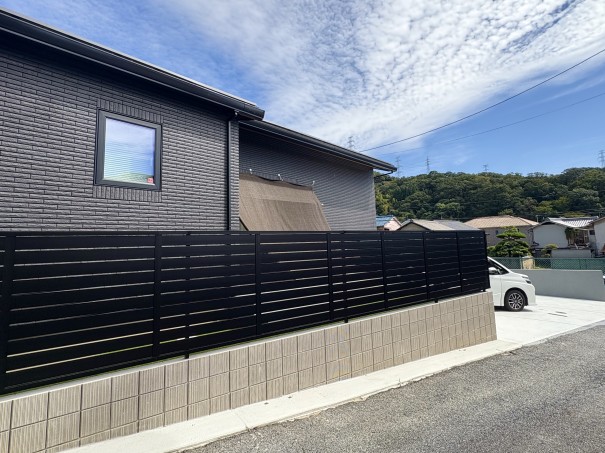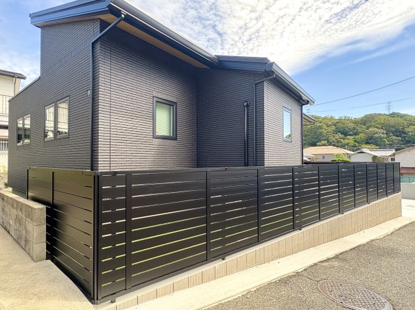 道路側の目隠しフェンスは、お家の雰囲気に合わせ LIXIL フェンスAB YS3型(横スリット) ブラックで囲みました。通行される方の視線もほとんど気にすることなく、お庭で寛いでいただけます。