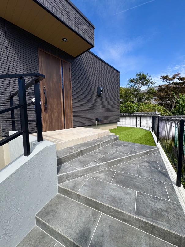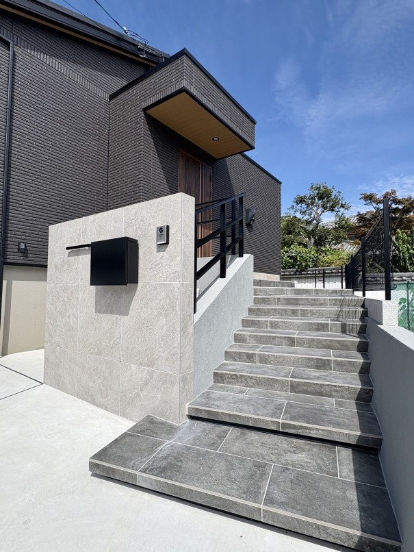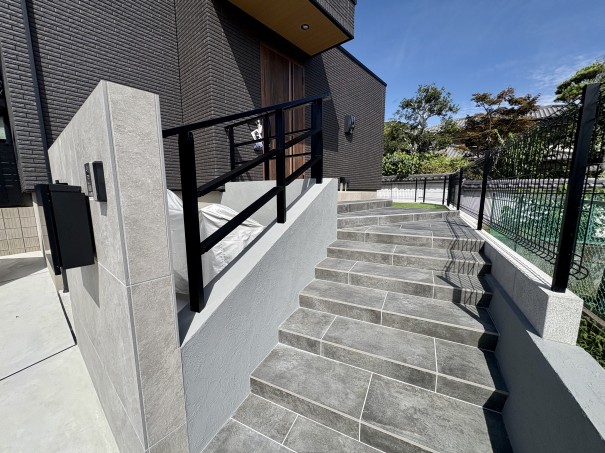 玄関に続く10段の緩やかなステップは、タカショー セラレバンテ ブラックを使用し、品格のあるアプローチが出来ました。左側に沿って転落防止のために取り付けた手すりは、三協アルミ ジーエムライン ブラック。足元の擁壁はジョリパット塗装で仕上げています。門柱の後ろにできたスペースは、駐輪スペースとしてお使いいただけます。正面からは見えにくく、盗難防止にも。