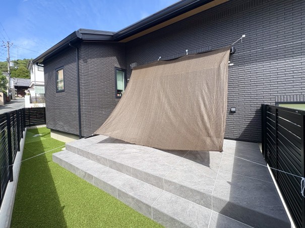 南側のお庭にはタイルデッキを設け、オオムラタイル エコストーン ダークで仕上げました。十分な広さがあるので使用用途も広がります。