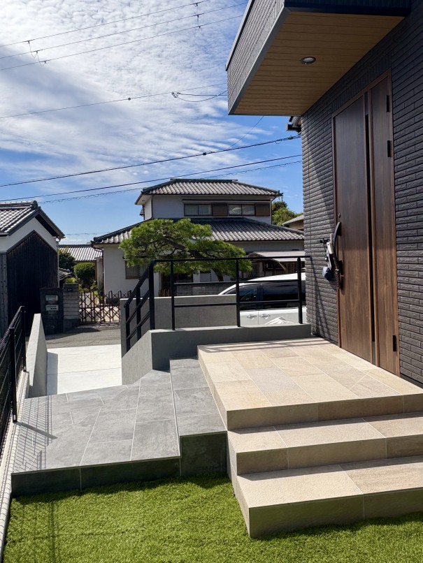 アプローチのステップの先は、自然な動線で既存の玄関ステップに続きます。お家の周りの人工芝は、下地だけ施工させていただきました。