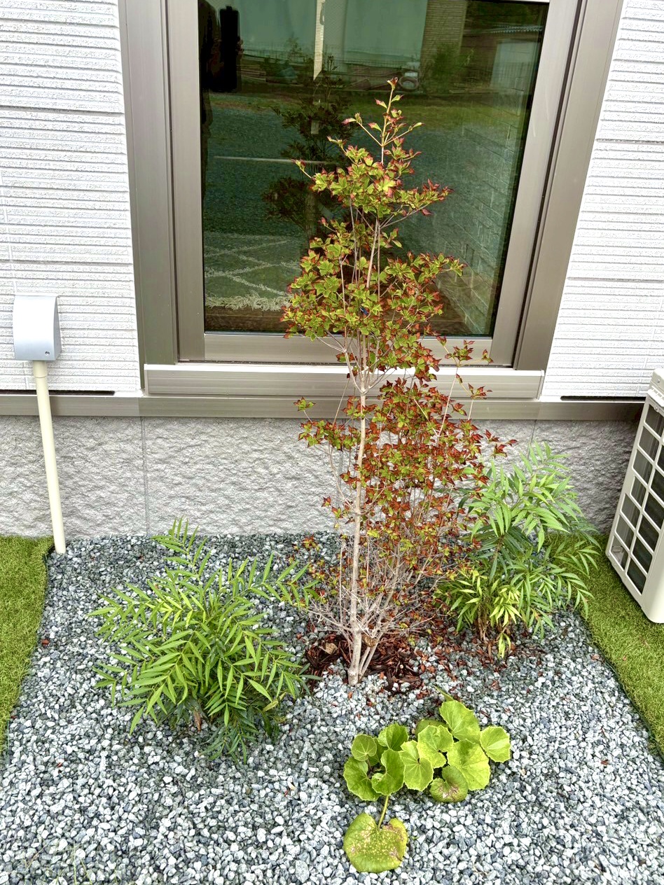 北側のお庭にも、ドウダンツツジ・マホニアコンフーサ・ツワブキを植え、お家の中からも緑を楽しんでいただけます。