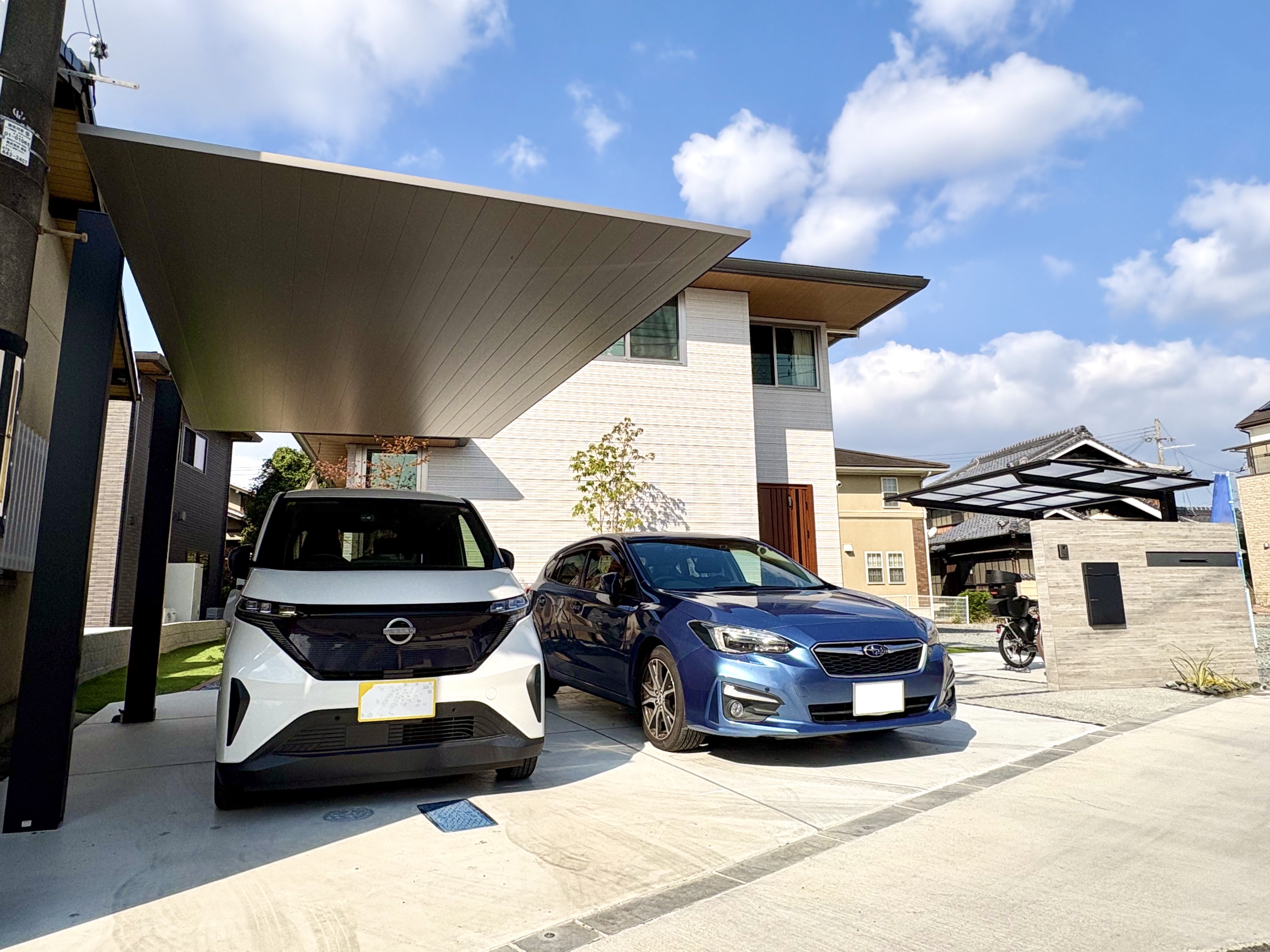 カーポートは、お家の雰囲気に調和するLIXILカーポートSC 1台用 ロング柱 ナチュラルシルバーF。洗練された佇まいを感じさせます。
