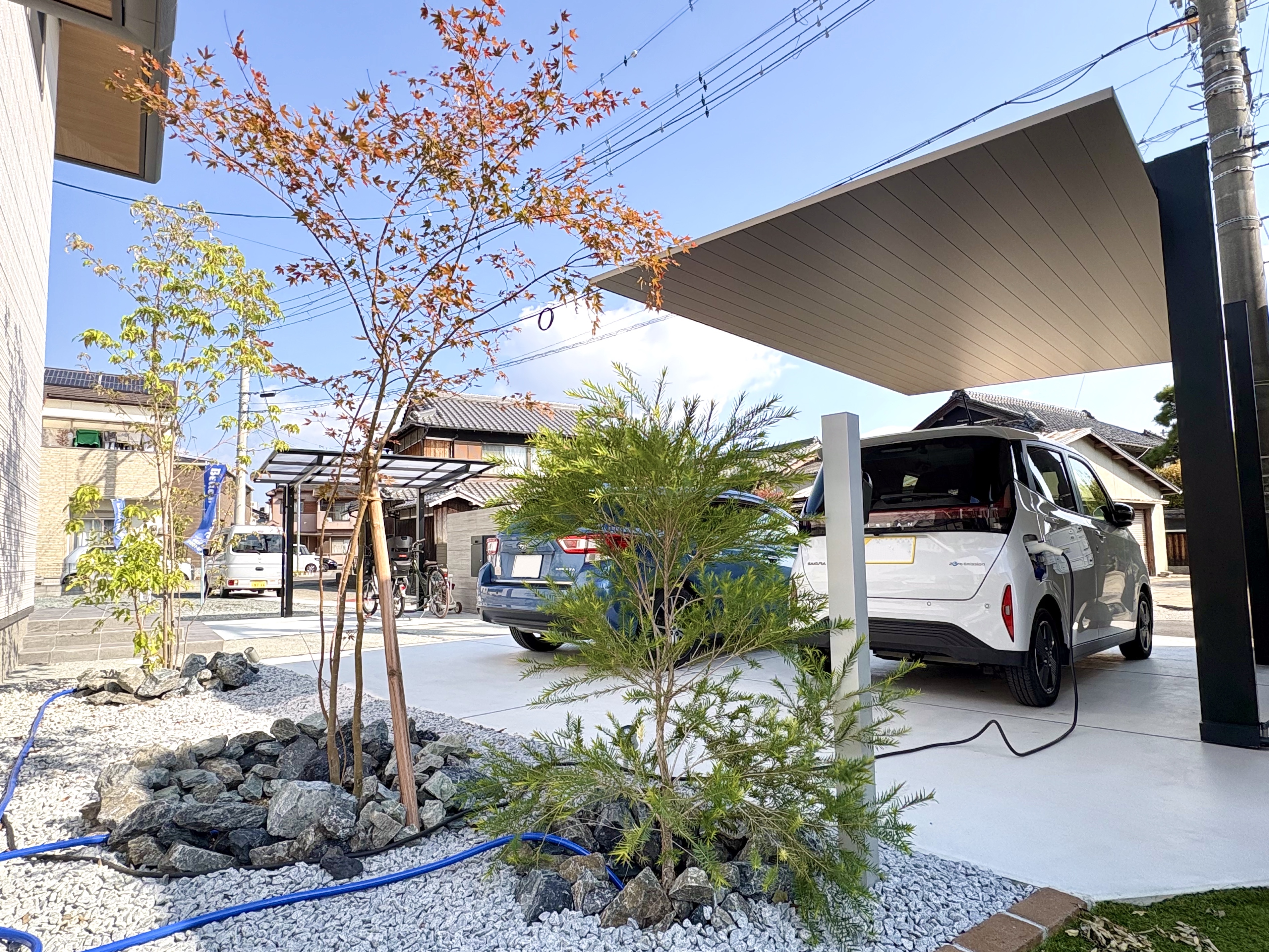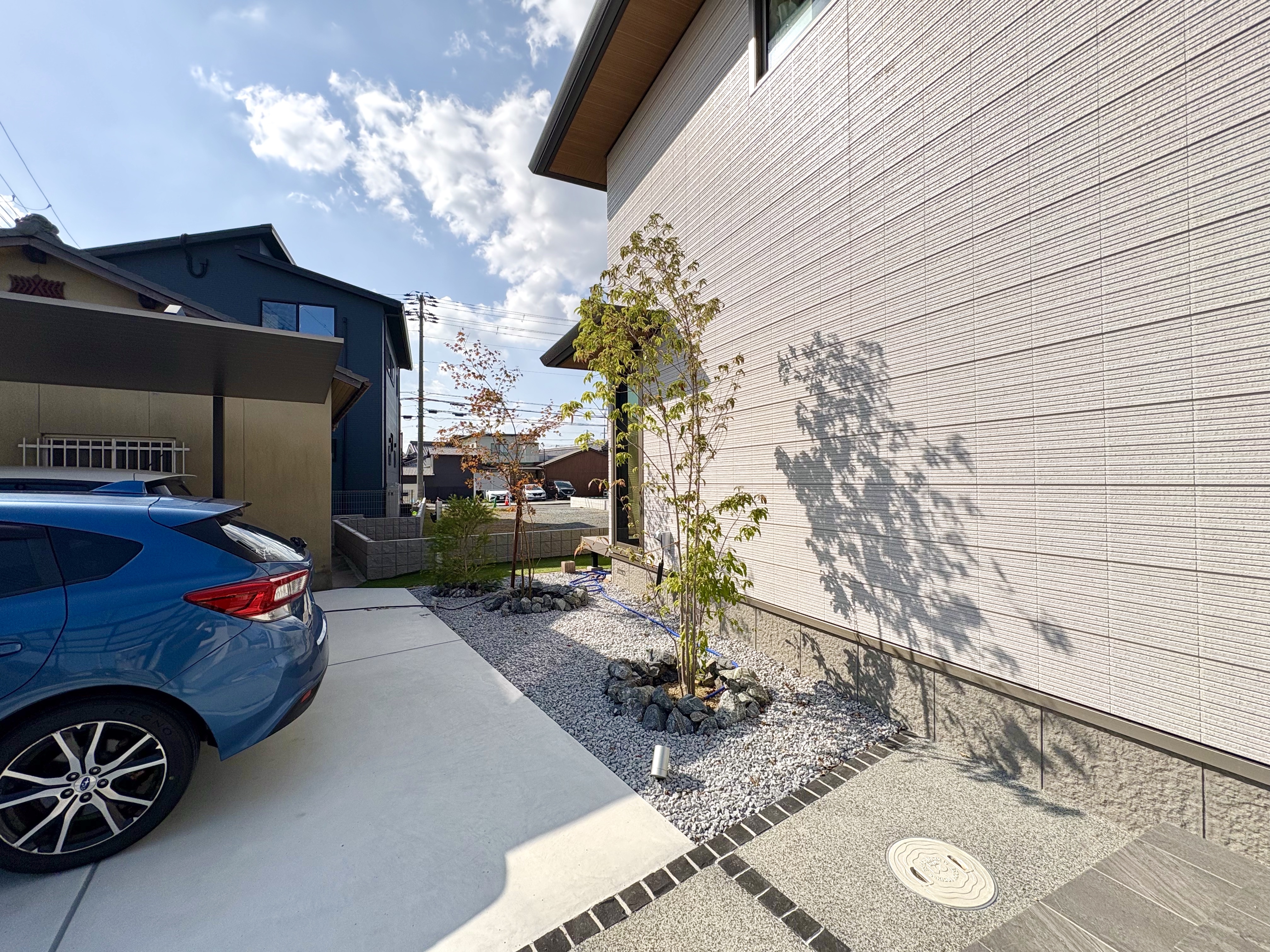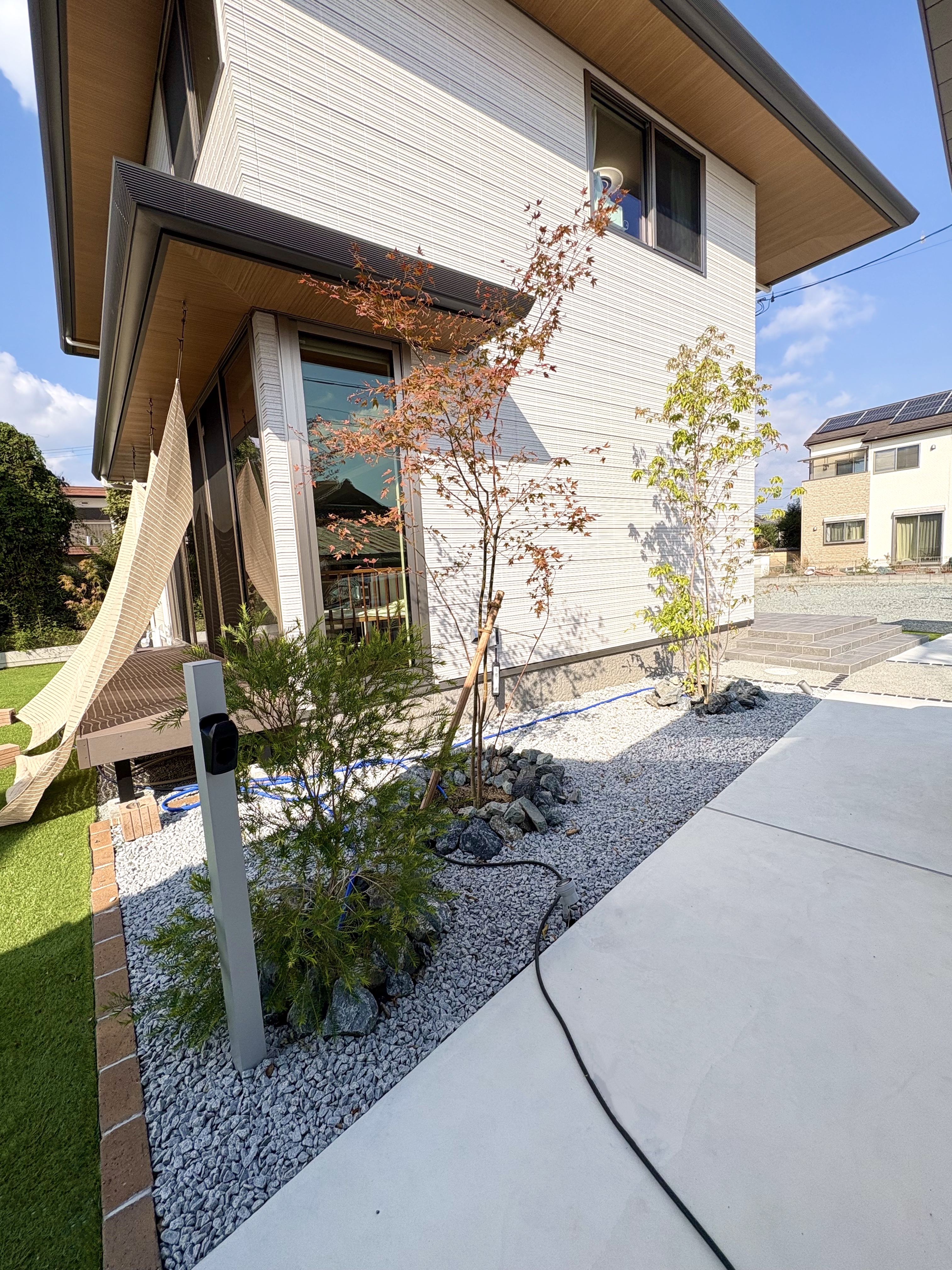 新築外構のご依頼を頂いた加古川市のM様。植栽に囲まれ、季節の移り変わりを感じる外構をご希望でした。