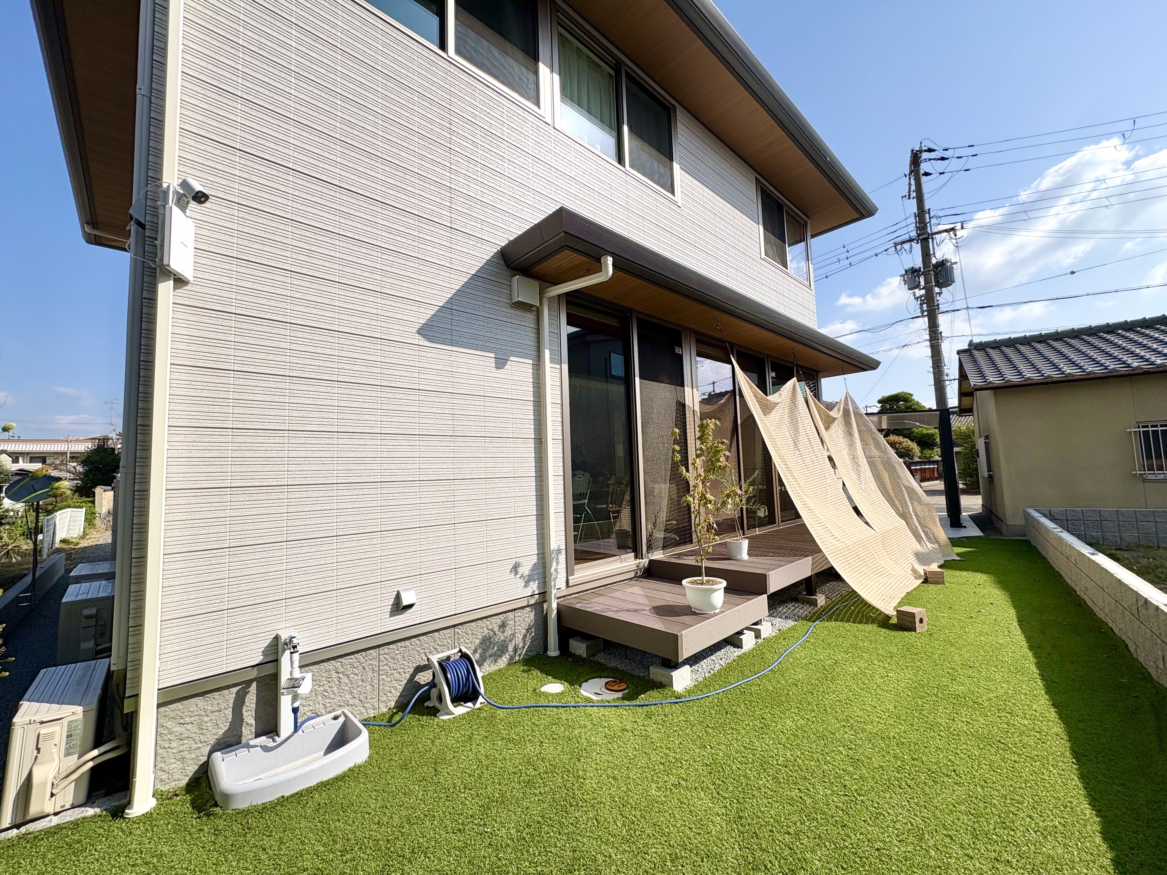 日当たりの良い南西側には、ウッドデッキとお子様が安心して遊べる人工芝の広いお庭が広がります。