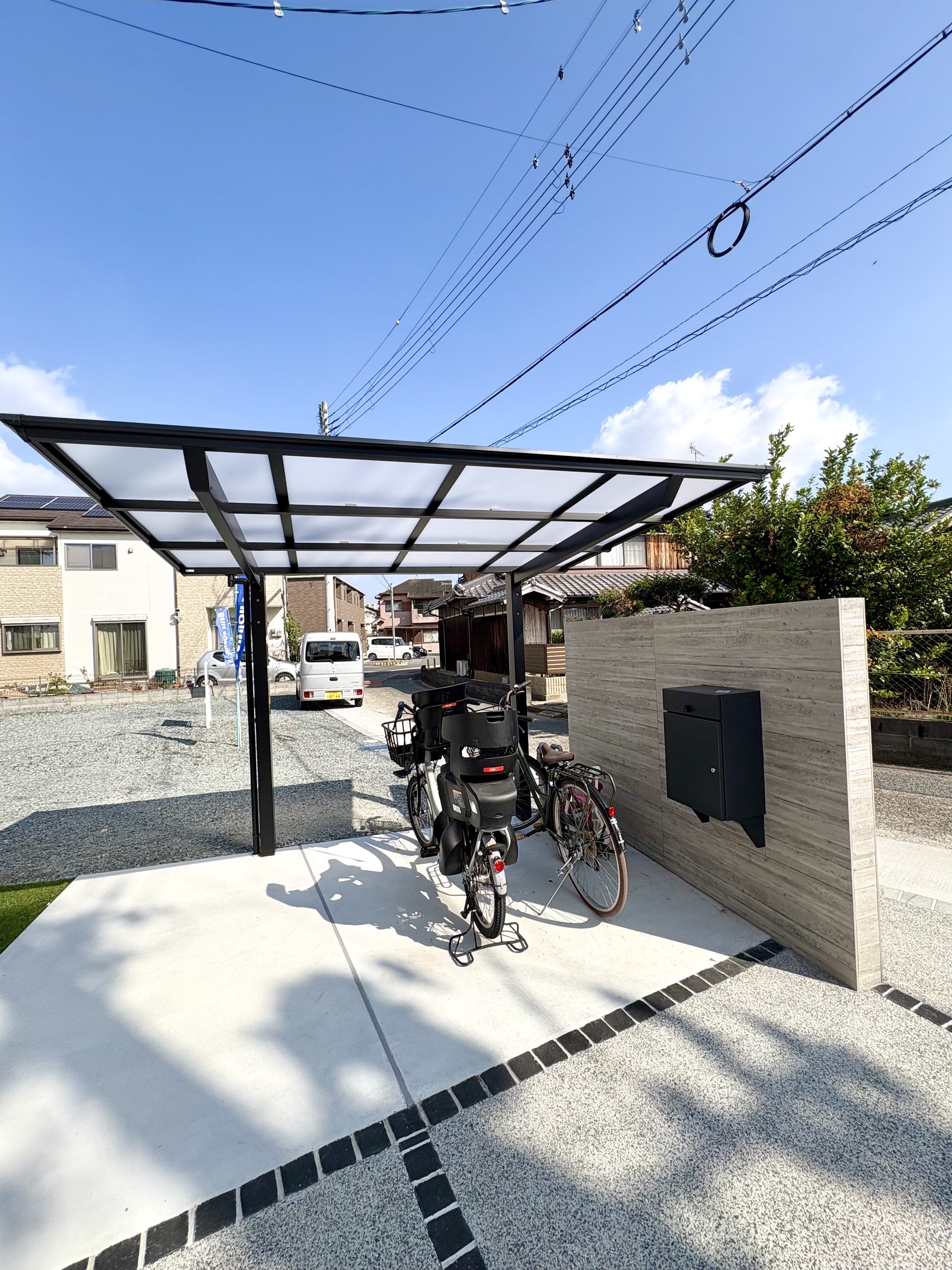 サイクルポートは、LIXILネスカFミニ。正面から見ると自転車が門柱に隠れ、玄関周りがすっきりした印象に。