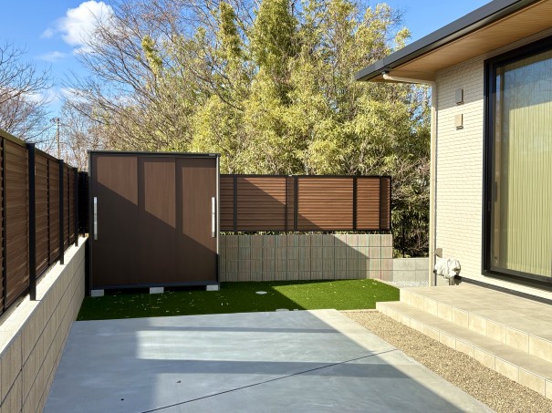 物置は、ヨド物置 エスモ ウッディココア。足元は人工芝を敷いています。目隠しフェンスは、LIXIL フェンスAB YL2型 横ルーバー。玄関ドアに合わせナチュラルな感じにまとめました。