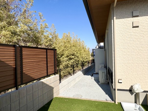 お家の周りは、防草シートの上に砕石を敷き、雑草対策も万全です。