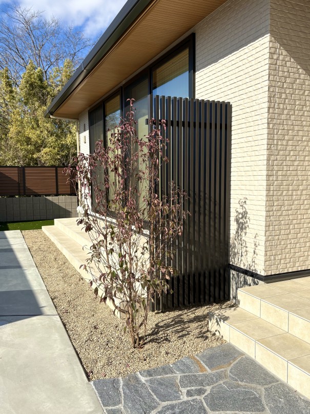 玄関の手前に季節の移り変わりを感じる常緑樹 常緑ヤマボウシを植え、タイルデッキとの間にはタカショー千本格子ユニット チャコールグレーをリビングの目隠しとして設置しました。