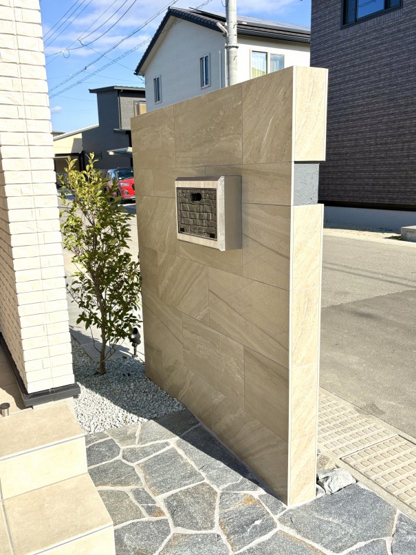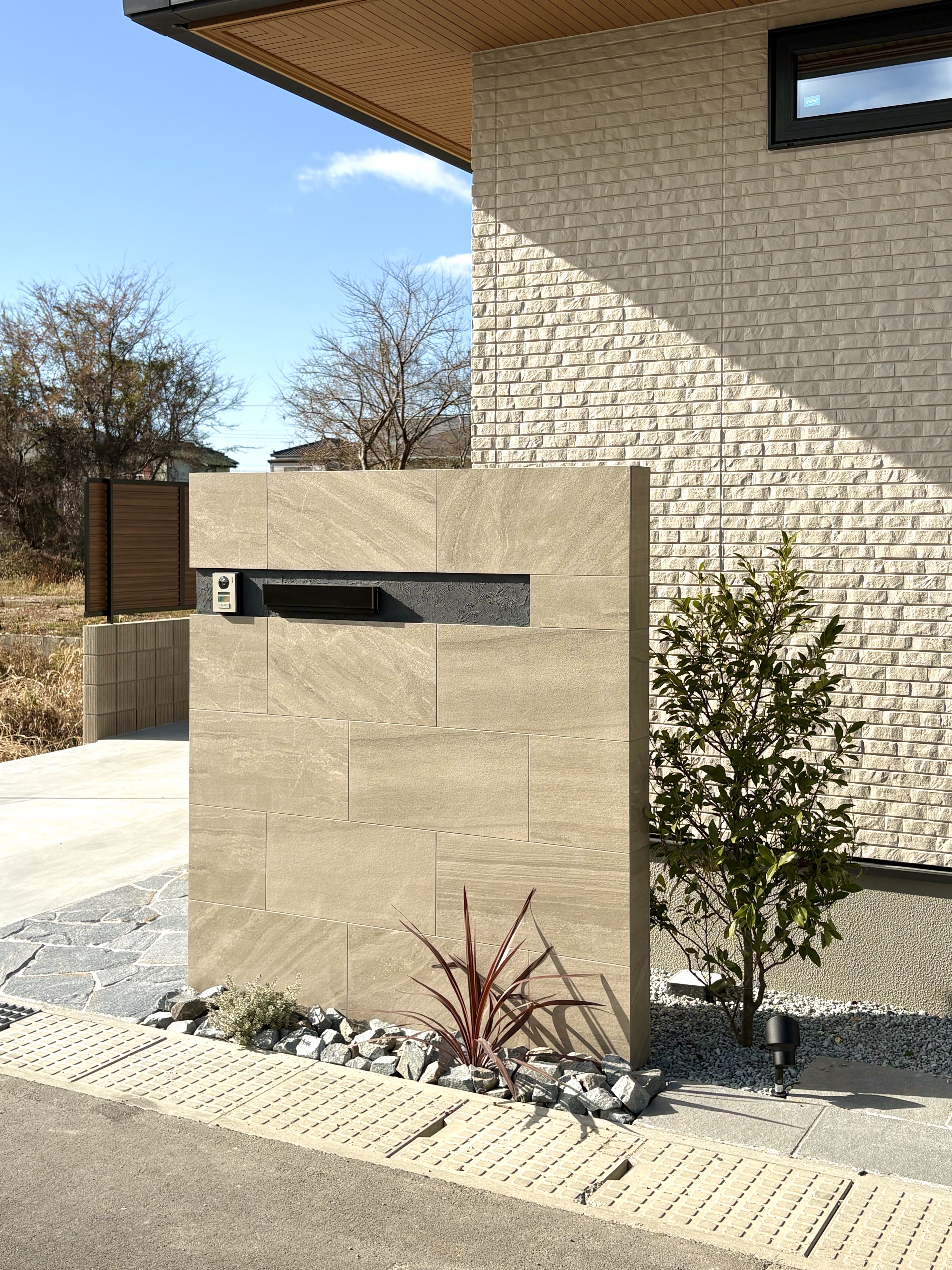 タイル貼りのデザイン門柱は、タカショー モーディカ グレージュを使用。表札部分はジョリパット塗装でアクセントを付けました。ポストはユニソン コラーナ05 ブラック。