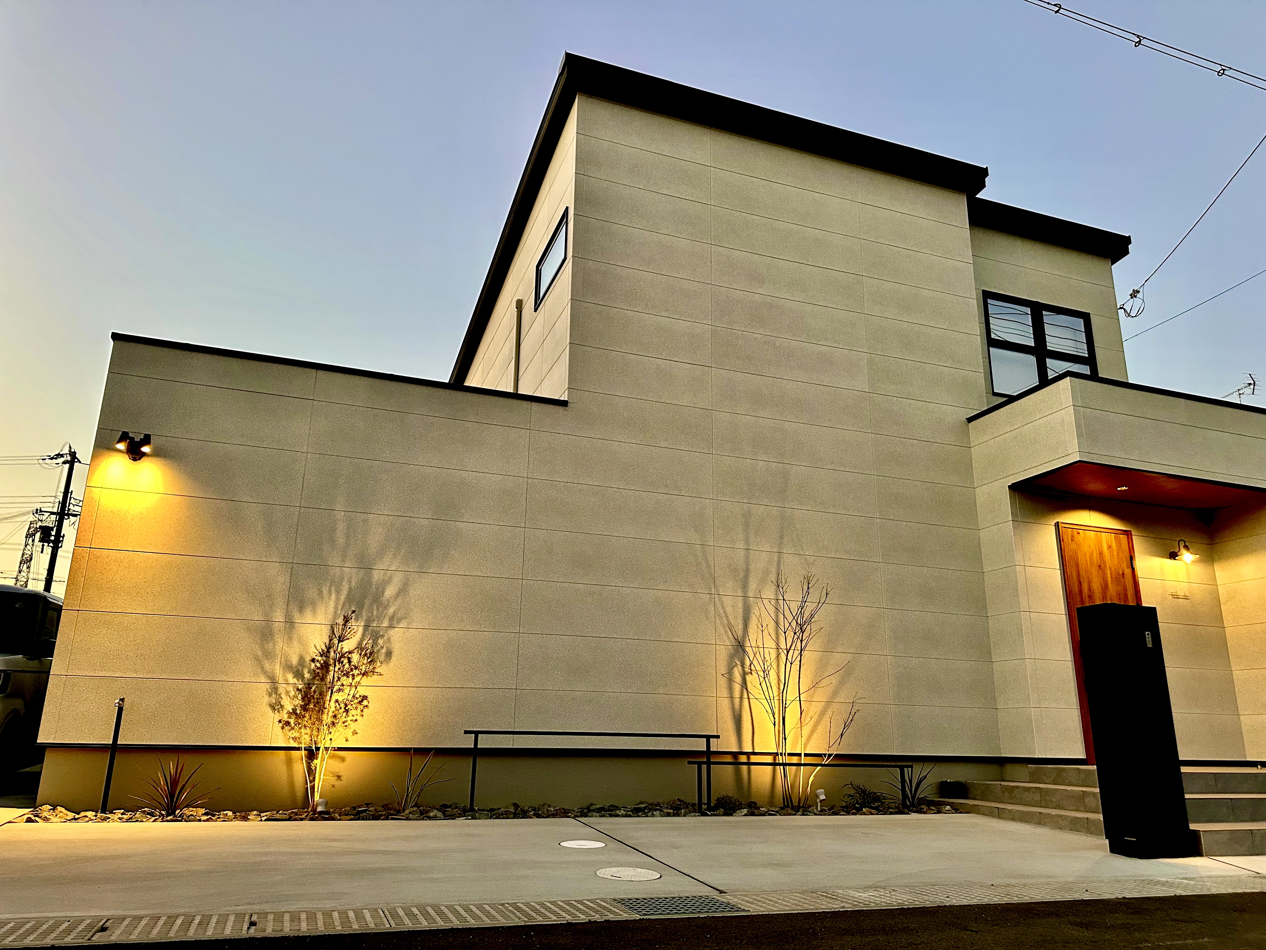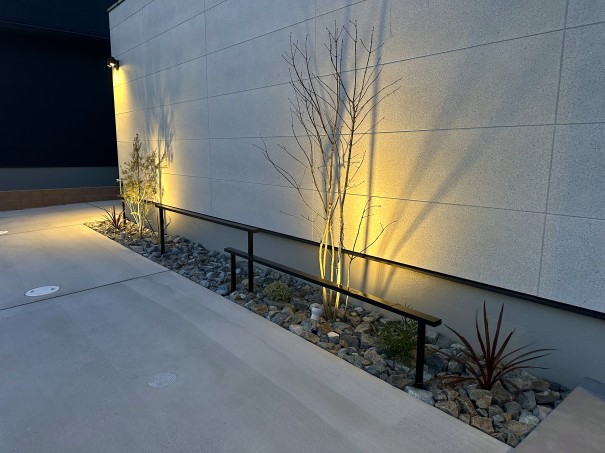 夜間はガーデンアップライト 電球色が灯り、昼間とは違う印象になります。