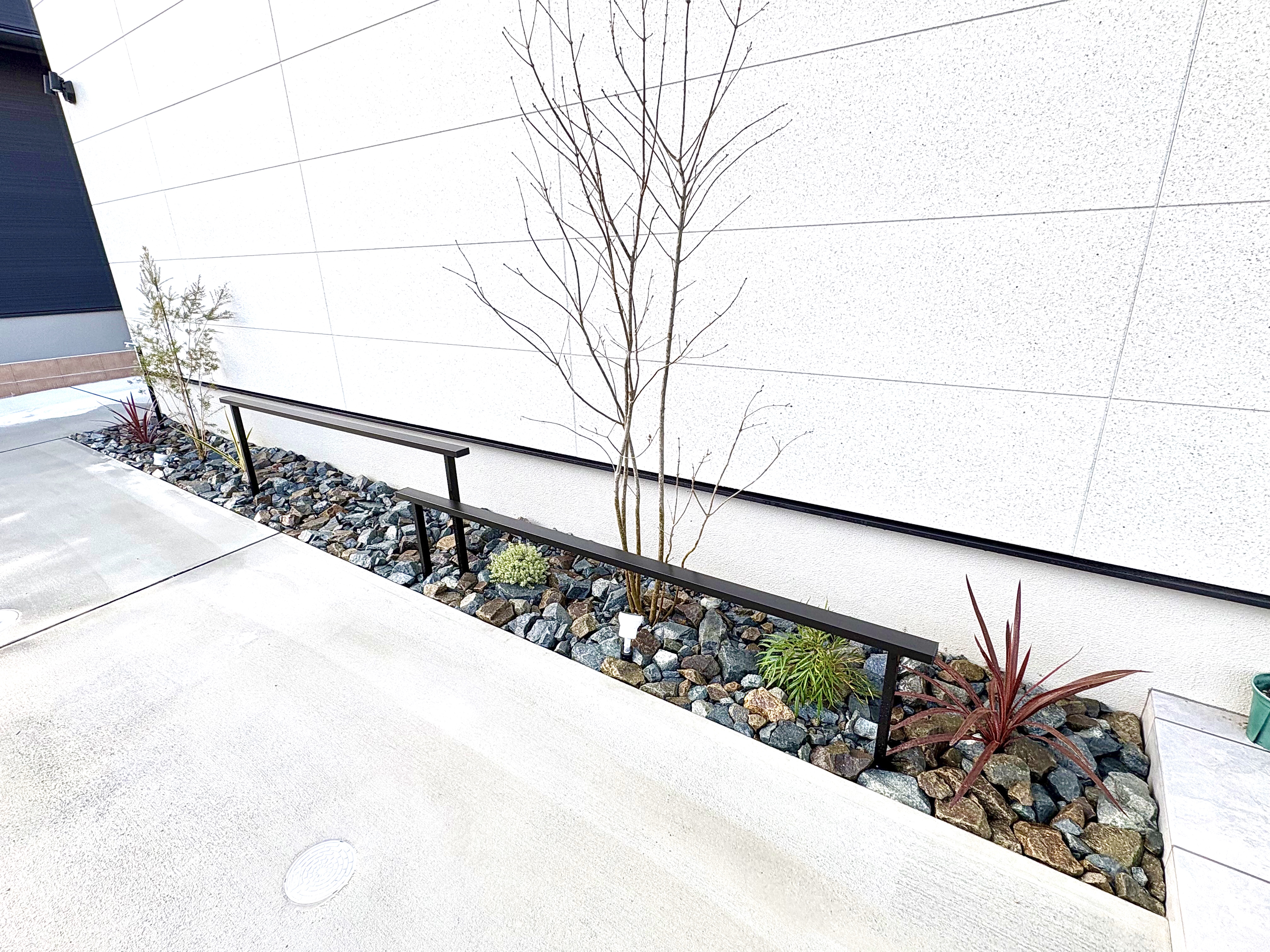 アオダモ、メラレウカレッドジェムを中心に、常緑の下草 コルジリネレッドスター・マホニアコンフーサ・ウエストリンギア・ニューサイランを植え、グレイッシュストーンを敷いてドライガーデン風に仕上げました。高さの異なる2つのLIXIL フェンスAL(フレームフェンス) ブラックがアクセントになっています。