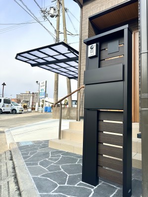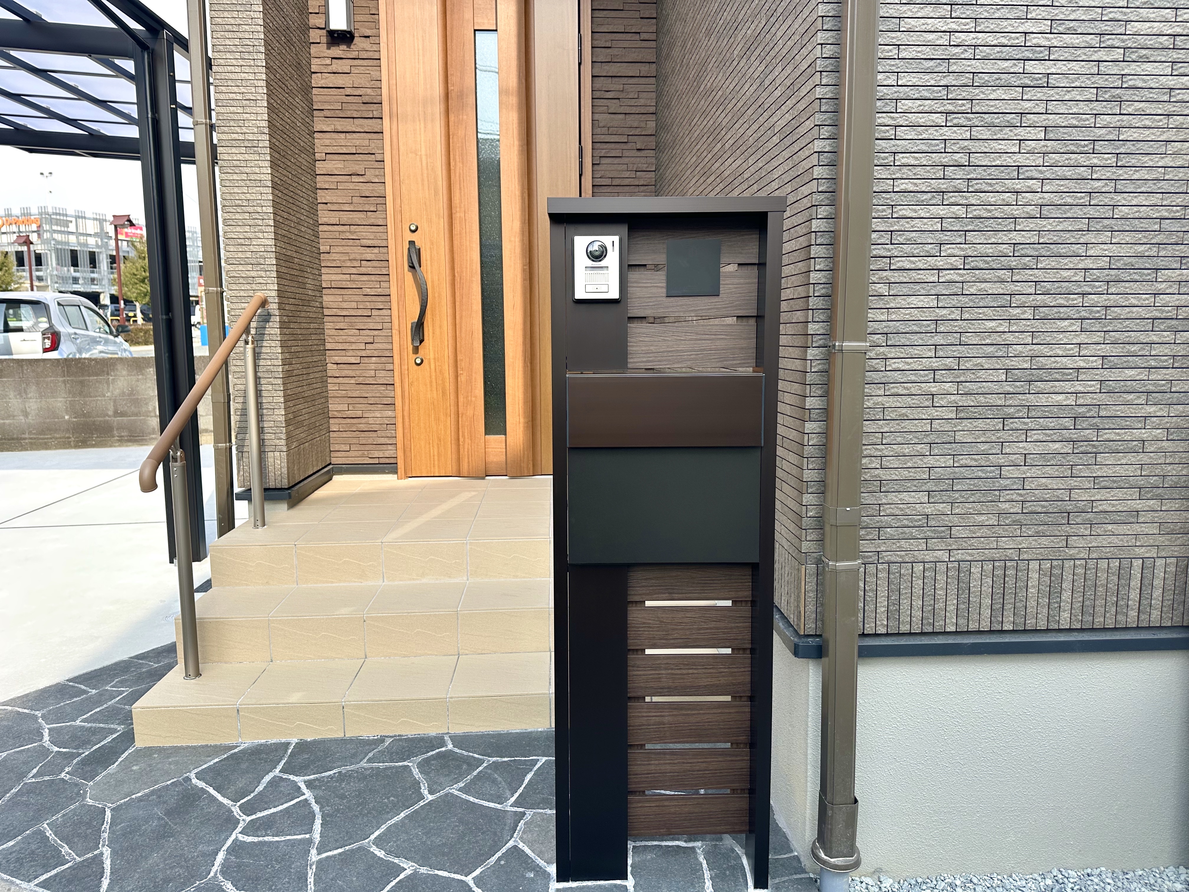 機能門柱は、YKK ルシアスポストユニット WD01型L ステインウォールナット・ブラック。オールインワンの高級感のある門柱です。