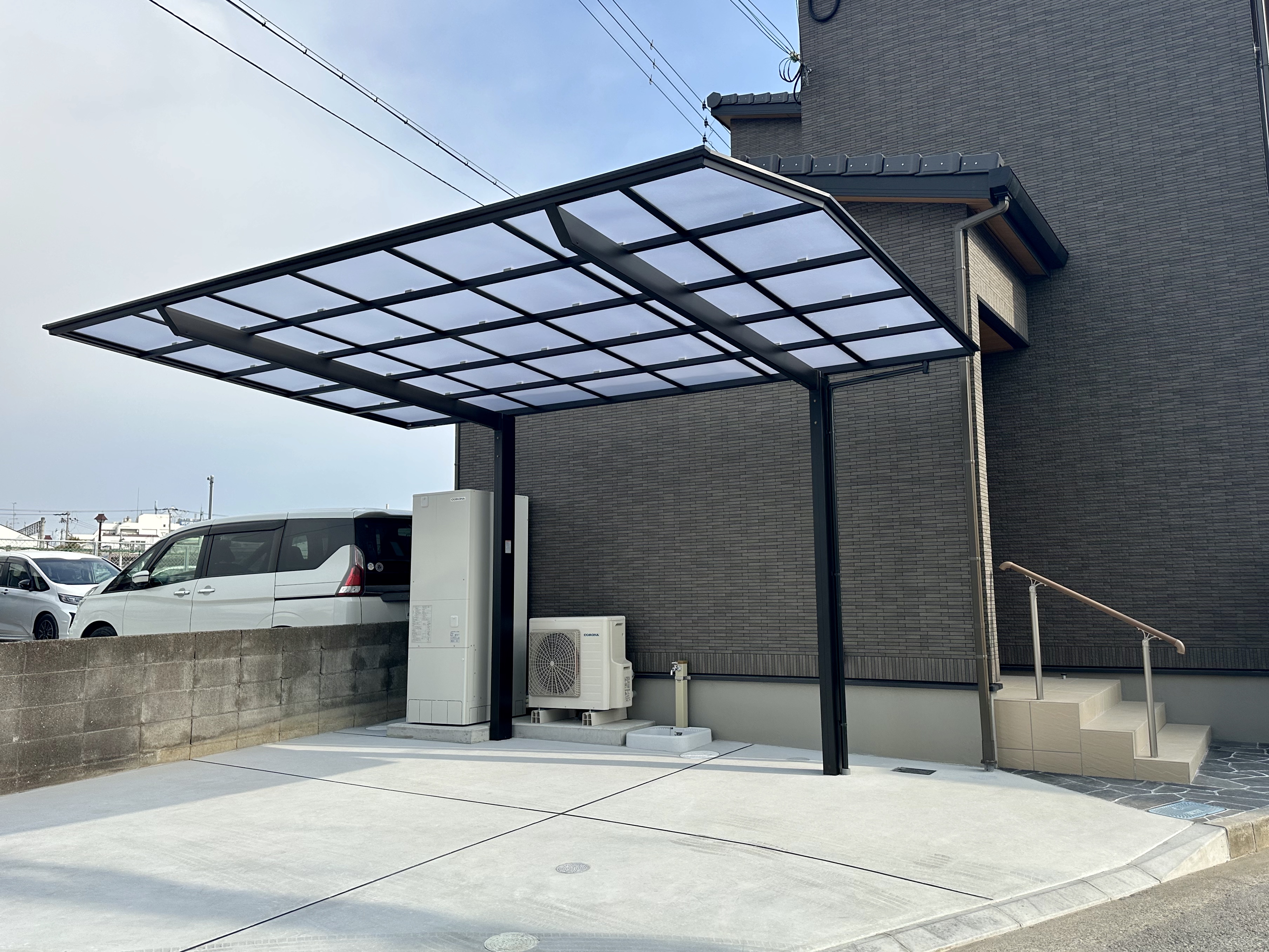 カーポートは、LIXIL フーゴF 1台用 ロング柱 ブラック。ポリカはクリアマットで明るい印象に。敷地の形に合わせて隅切り加工も施しました。