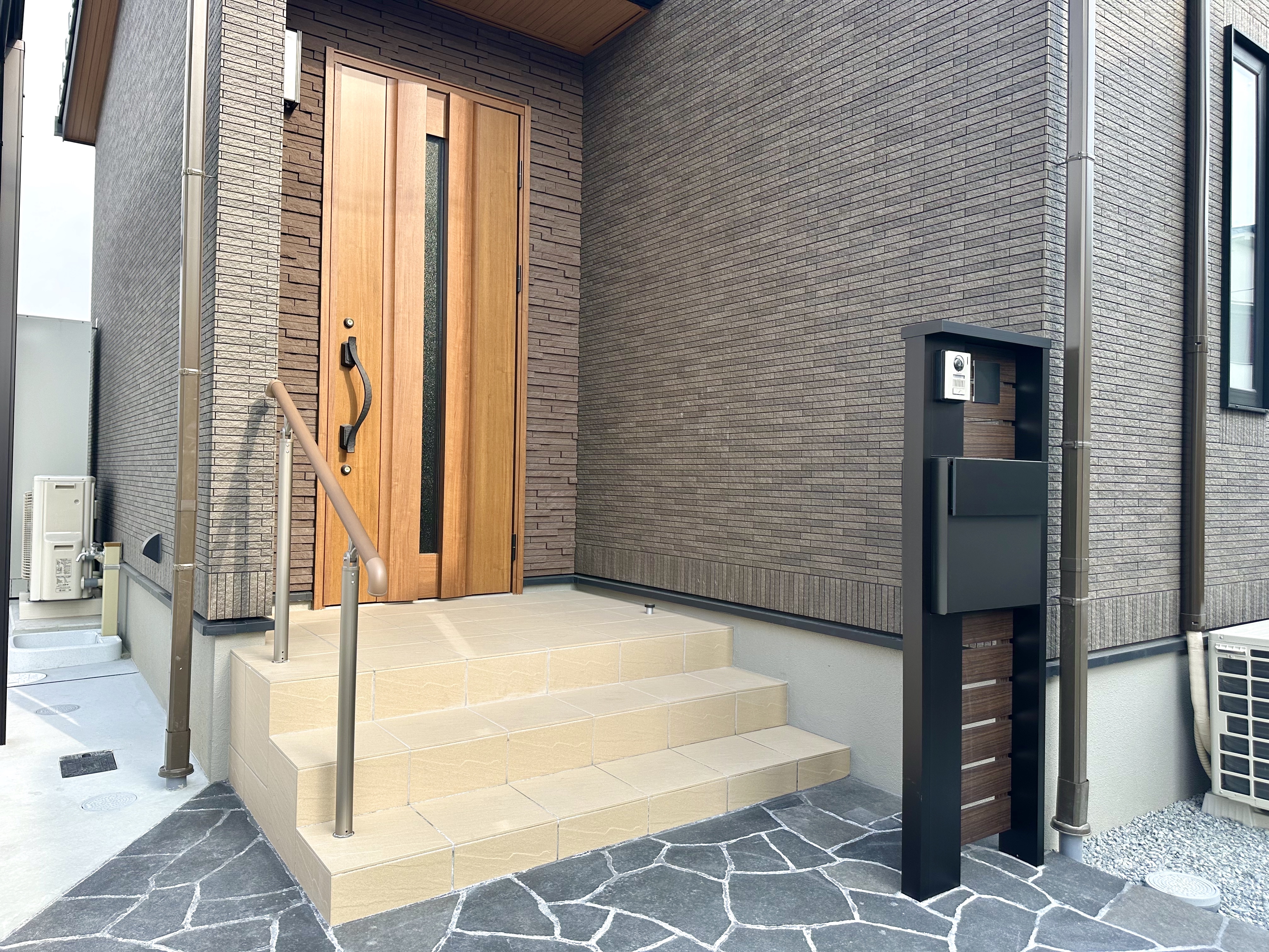 アプローチには、落ち着いた色調の乱形石 バサルトストーンを敷きました。玄関ステップにはLIXILの補助手すりを設置しました。お子様の落下も防いでくれます。
