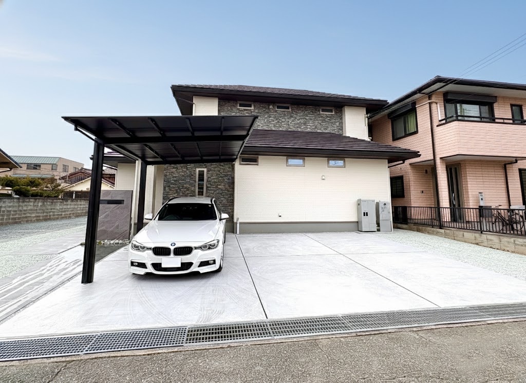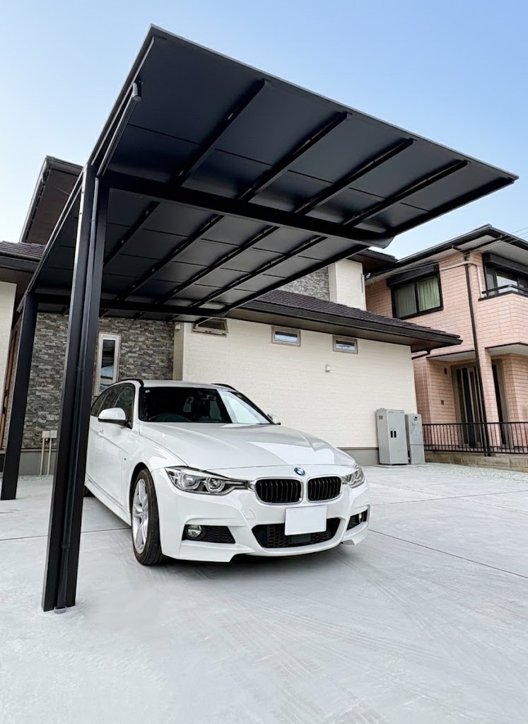 カーポートはLIXIL ネスカF 1台用 ロング柱を玄関にいちばん近い位置に設置しました。ブラックポリカは遮光性に優れ、愛車の劣化を防ぎます。ファサードや全体の印象も引き締まりました。