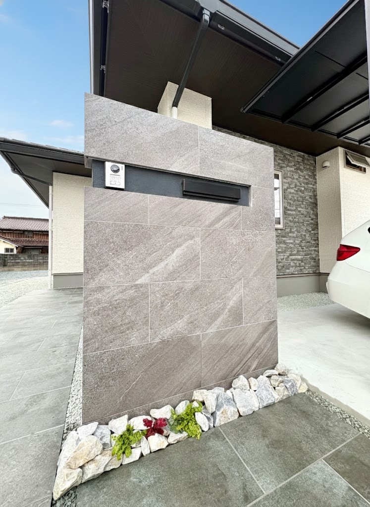玄関周りの目隠しも兼ねた高さ1.6m、幅1.2mのデザイン門柱は、タカショー アヴェルサ ディープグレーのタイルを貼り、ジョリパット ブラック塗装で変化をつけました。足元には日陰の下草を植え、フーベイロックを敷き仕上げました。