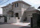 ピンクの素敵な外観が特徴的な加古川市のH様邸。お家の外観に合わせて、優しい雰囲気の外構となりました。オーバードアはTOEX製で、2台用+1台用を並べて取り付けました。