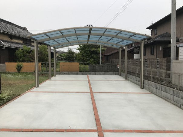 加古川市のM様邸、数年前に門まわりの工事をさせていただき、今回追加で駐車場とカーポート工事をさせていただきました。カーポートは三協のカムフィエースワイド 奥行延長タイプ。車+自転車の駐輪等、ゆったりと使っていただけるサイズです。