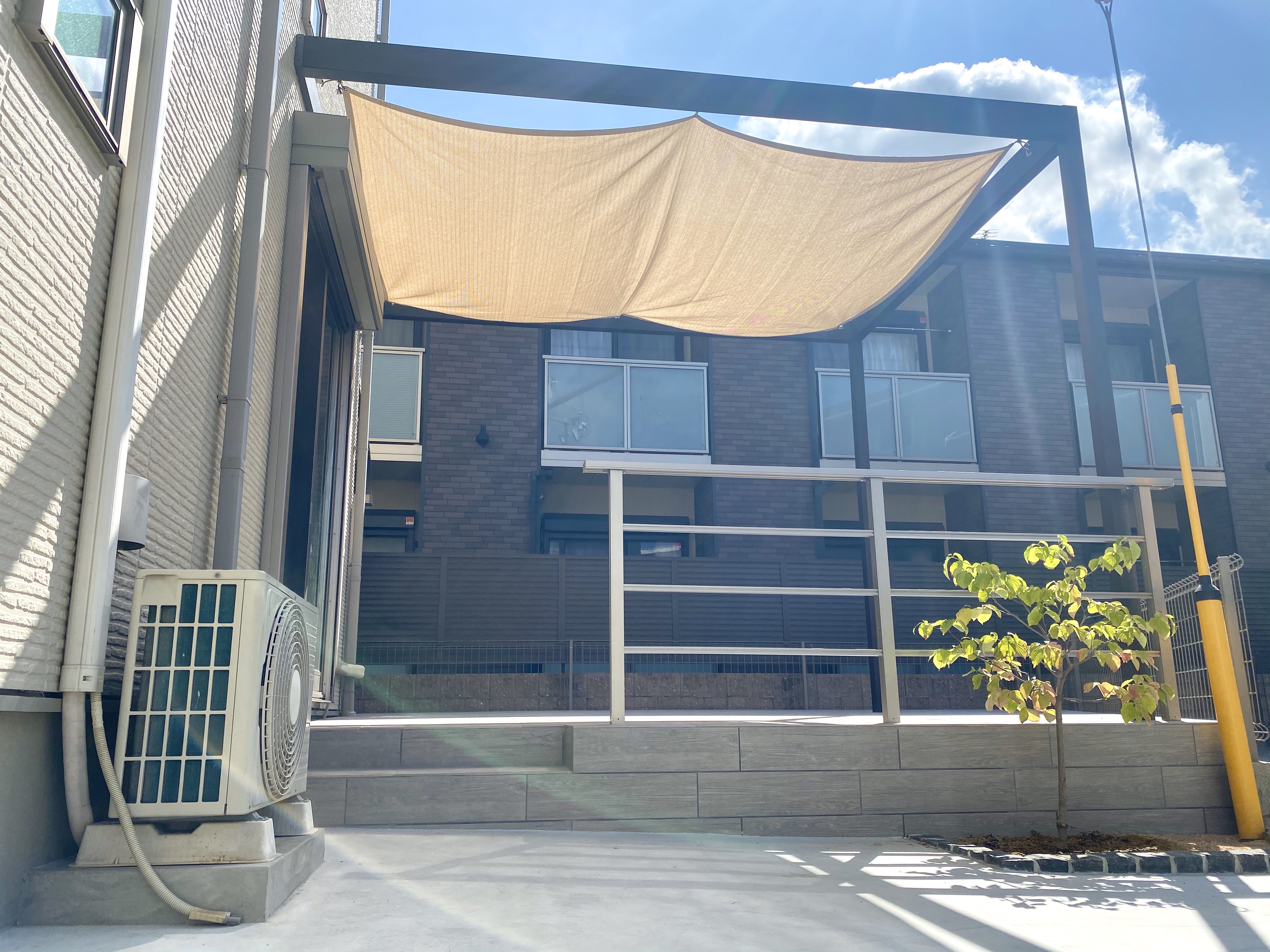 新築外構をさせて頂いた際に、真砂土のまま残していたスペースの有効活用についてご相談いただいた高砂市のM様。南向きの大きな窓に面したスペースを一面タイルデッキにするご提案をさせていただきました。