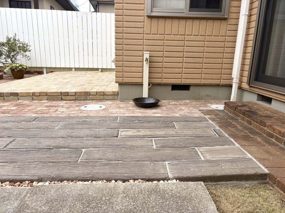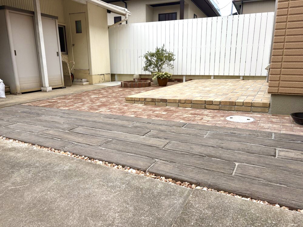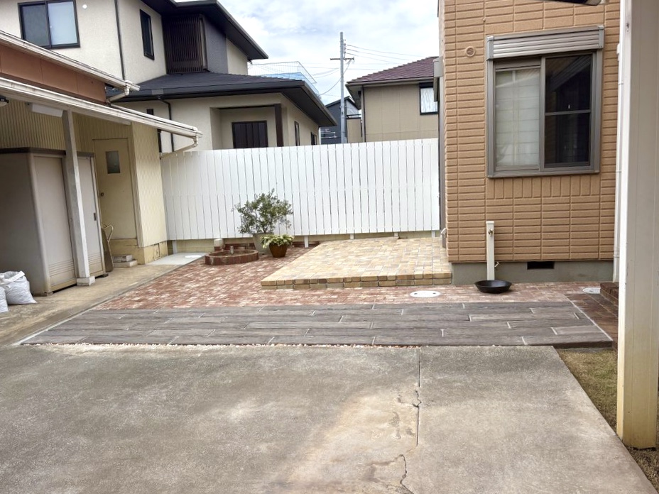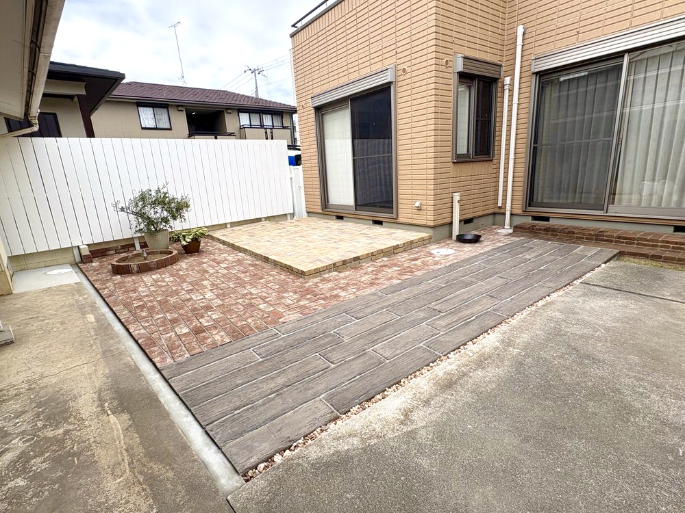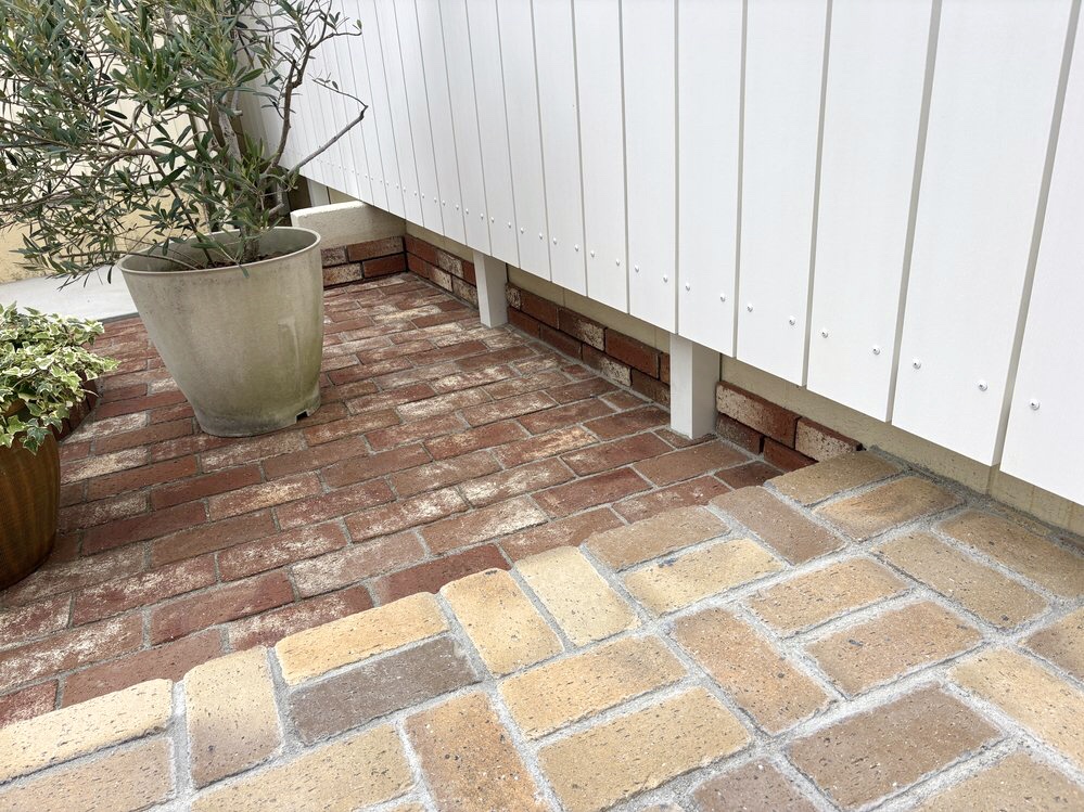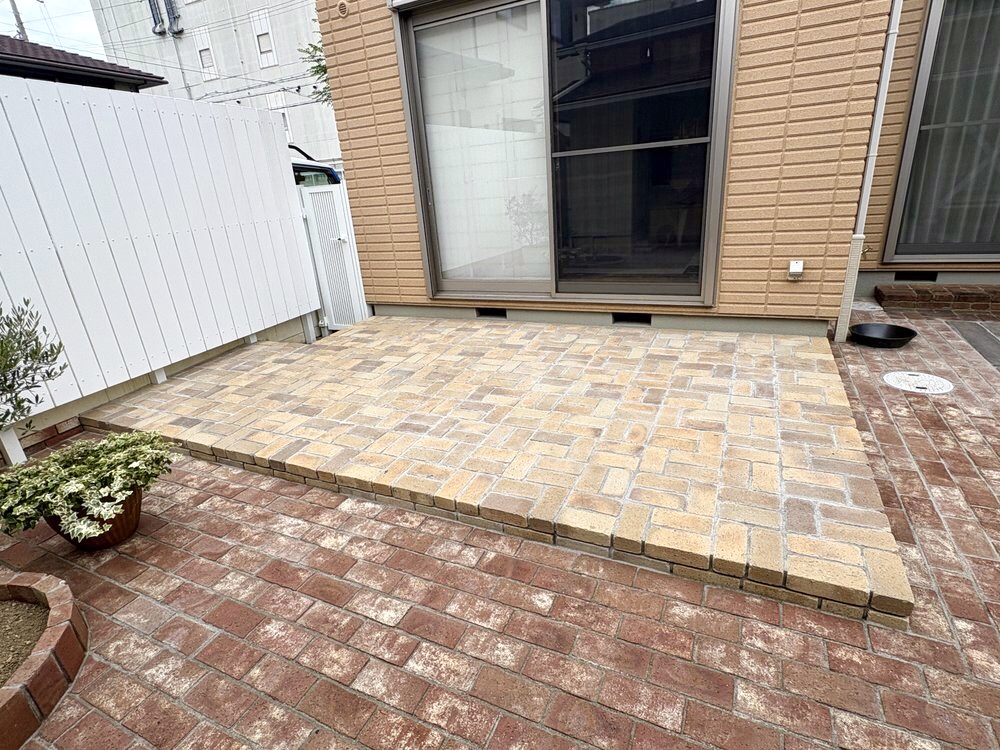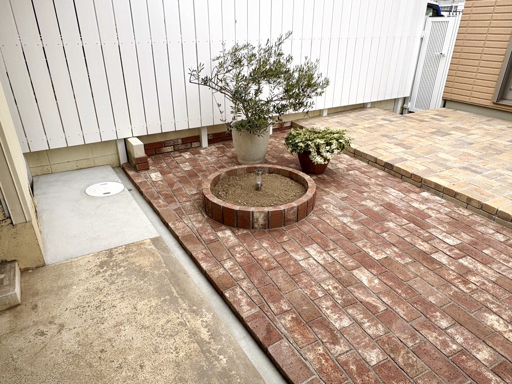 植物を一掃整理し、広いレンガ敷きのデッキを設けました。デッキ部分は、ソイルレンガ・アンチックイエローを使用し、ハーフバスケットウィーブ模様で敷きました。デッキの周りは、濃いめの色味のディアナブリック・レトラローズで囲い、コントラストをつけました。