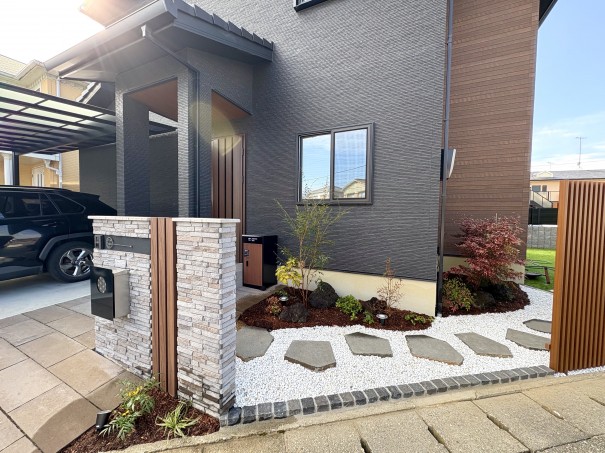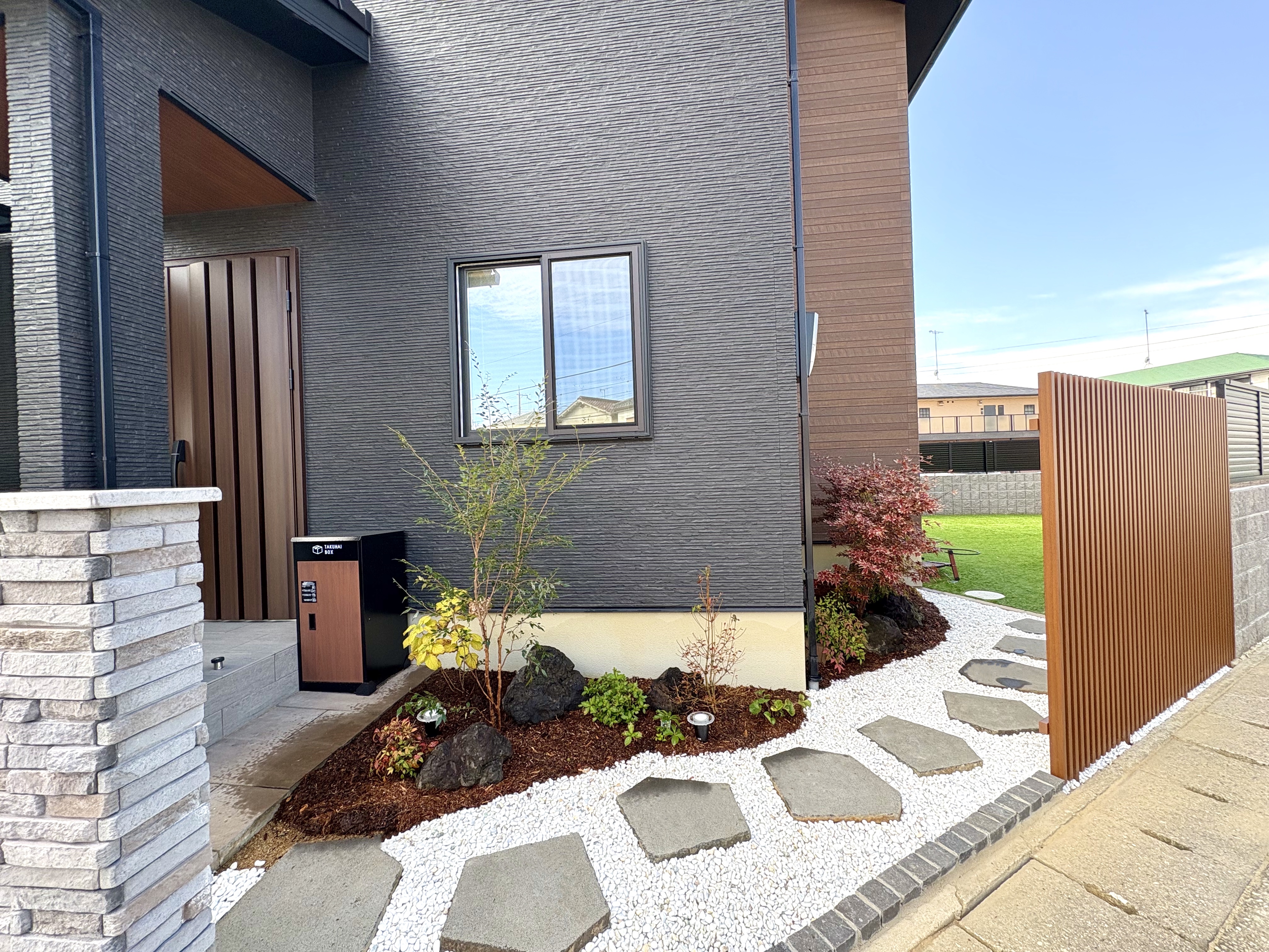 ランダムに並んだ玄武岩の飛び石が、白い化粧砂利に映えます。タカショーの千本格子ユニット ウォールナットを設置することで、道路からの視線をさえぎり、落ち着いた空間となりました。