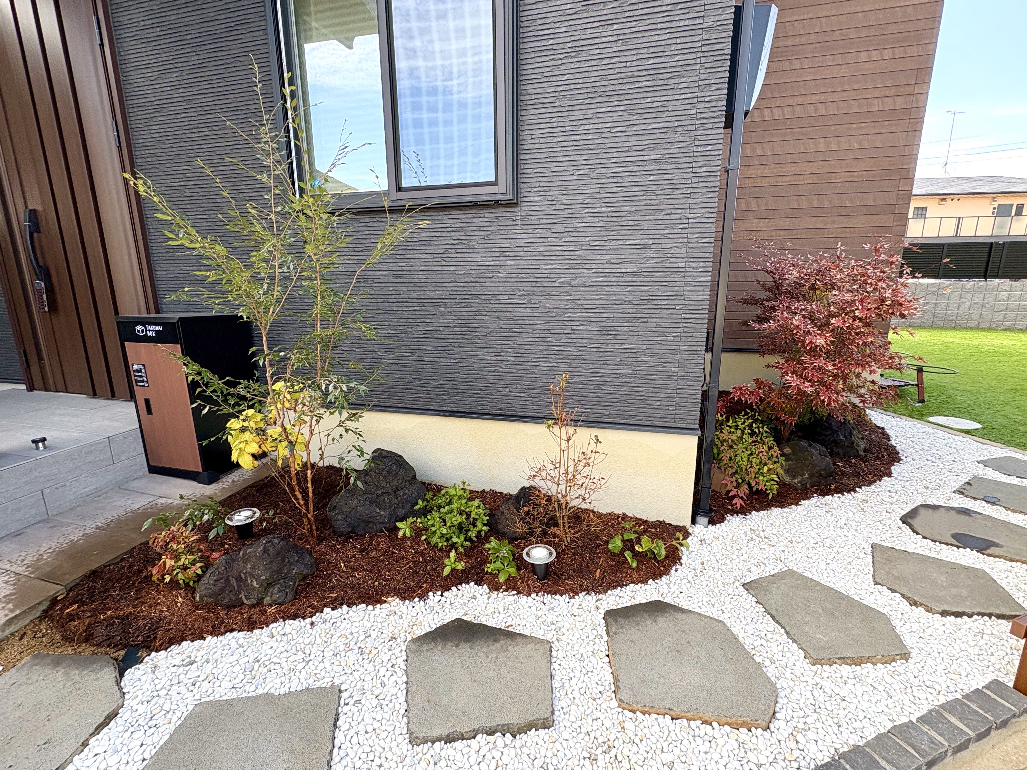 お庭側の花壇は既存のモミジ、ナンテン、タマリュウを活かしながら火山岩石を配置しました。花壇の仕上げにマルチバークを敷きつめました。雑草を防ぎ植物を暑さ寒さから守ってくれます。