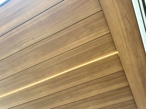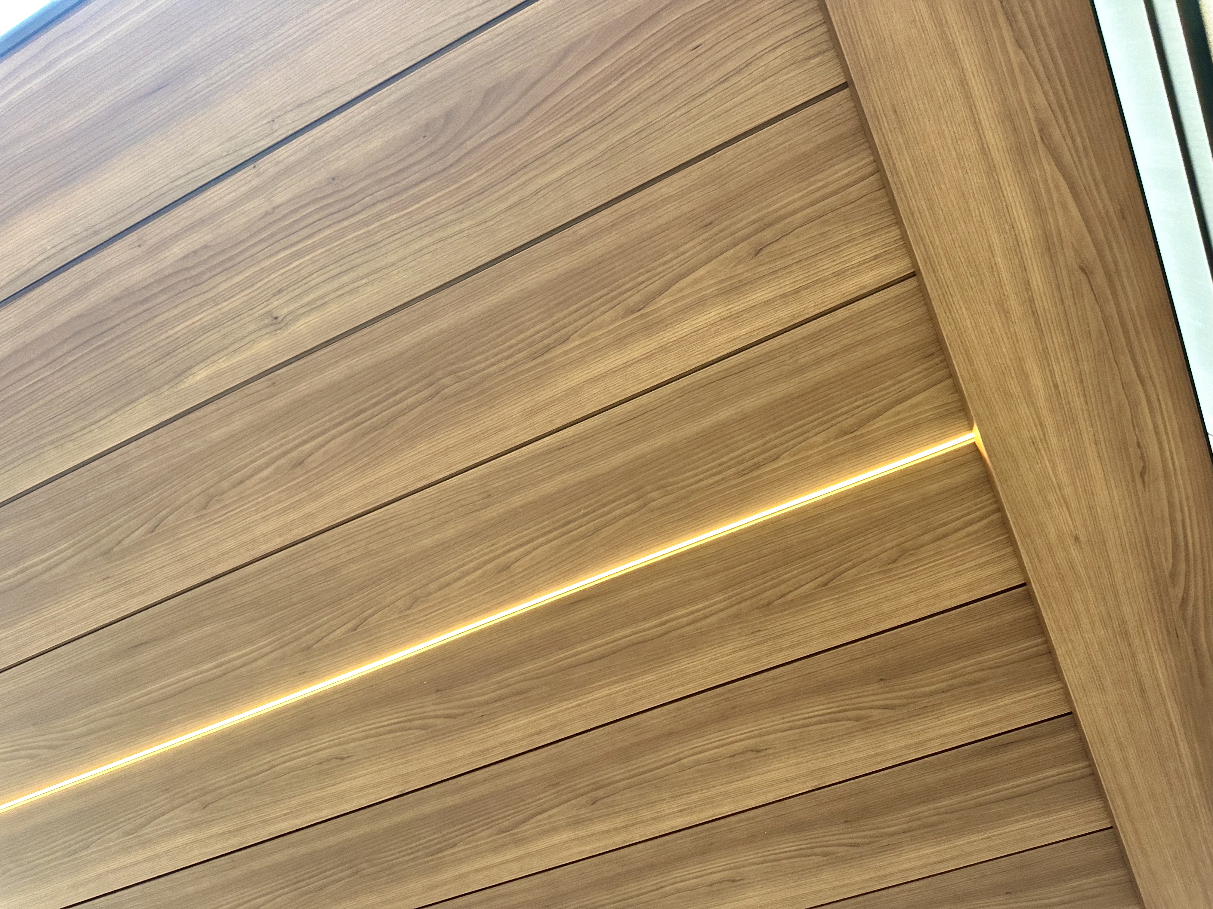 屋根下には最新のドットレスライン照明。照明の存在を主張しすぎず、カーポート下の空間を間接的に照らし出します。