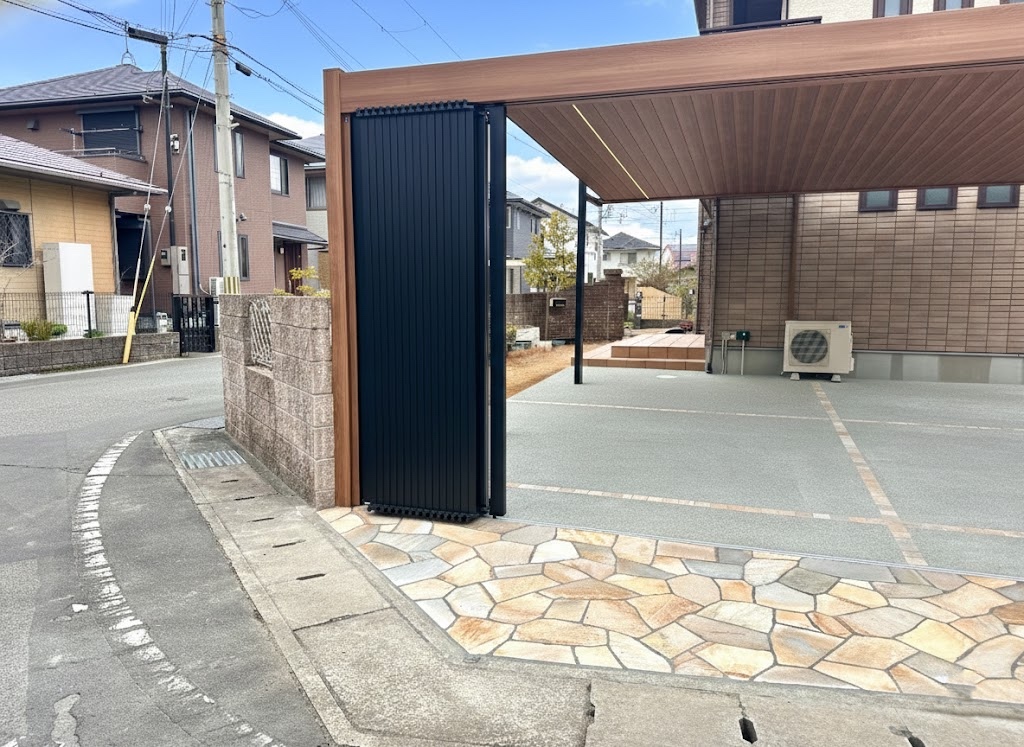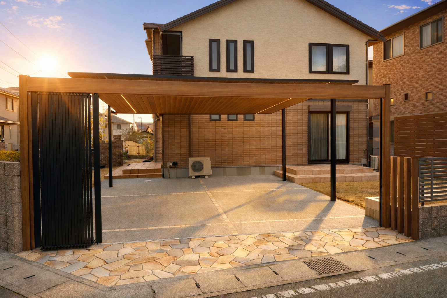 木調色のFⅡと電動門扉ライアーレが調和した、バランスの良いカースペース 姫路市T様邸