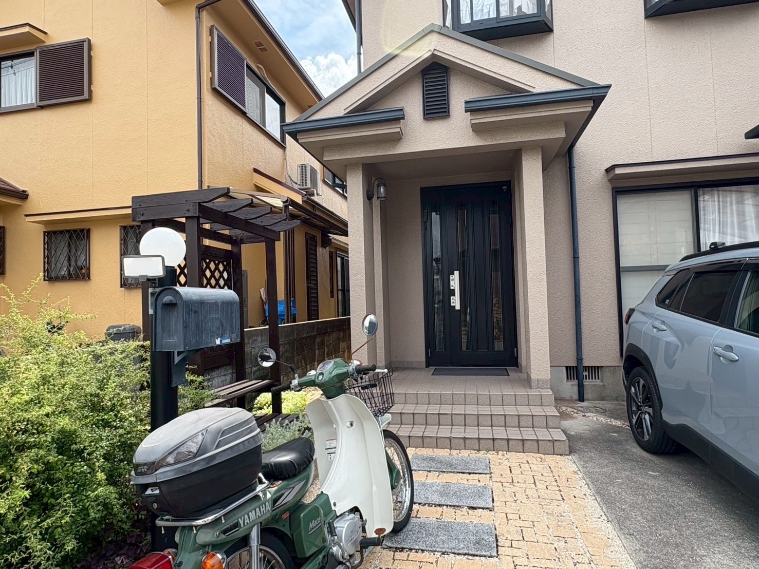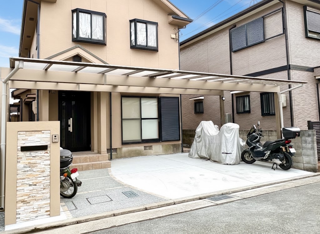 カーポートは三協 スカイリード 両側支持タイプ アーバングレー・トラッドオーク。足元には大切なバイクの盗難を防ぐ、サイクルバーセットも付けました。ポリカはかすみを使用し、全体に屋根が増えても玄関周りが明るい印象になりました。