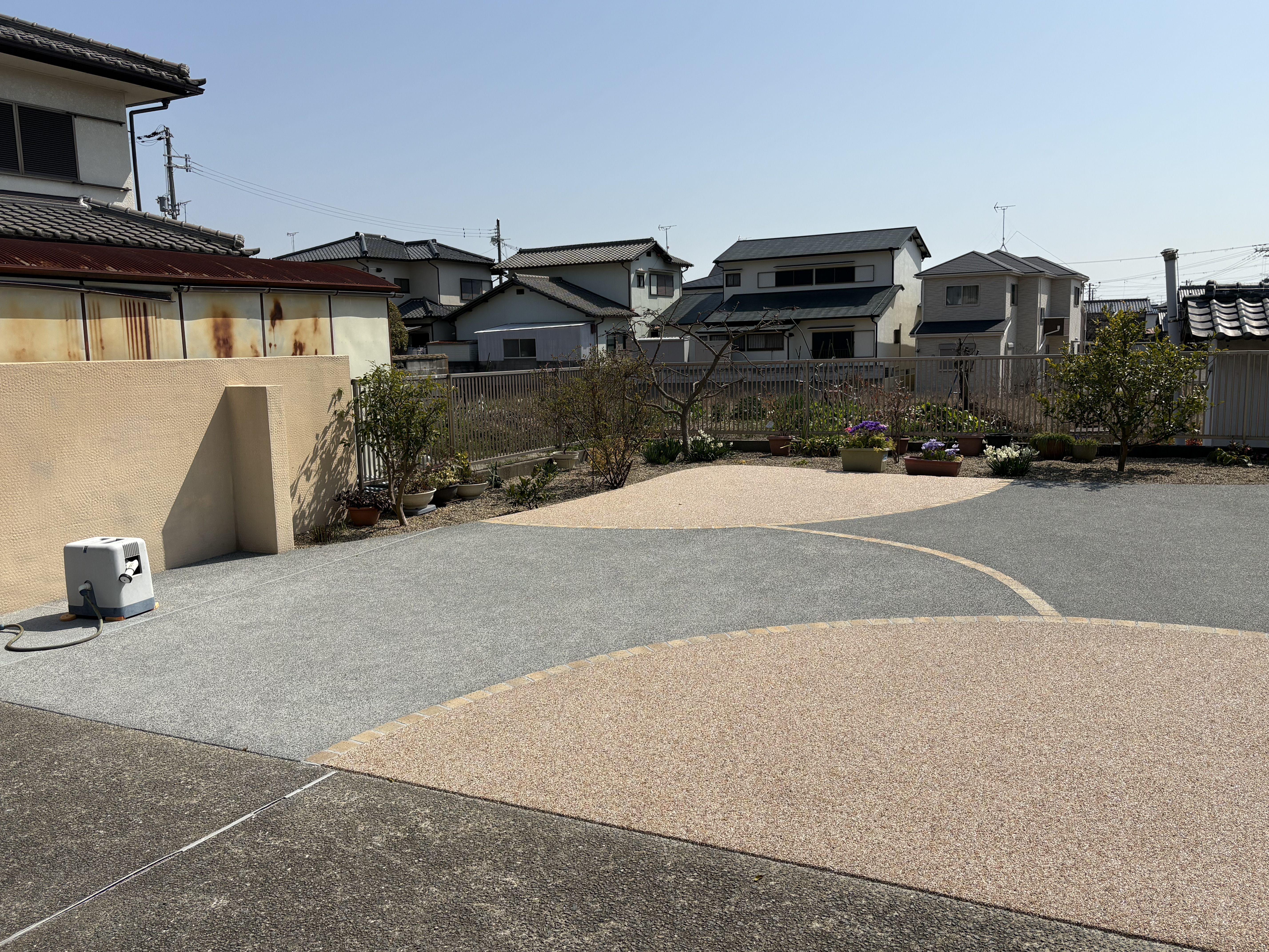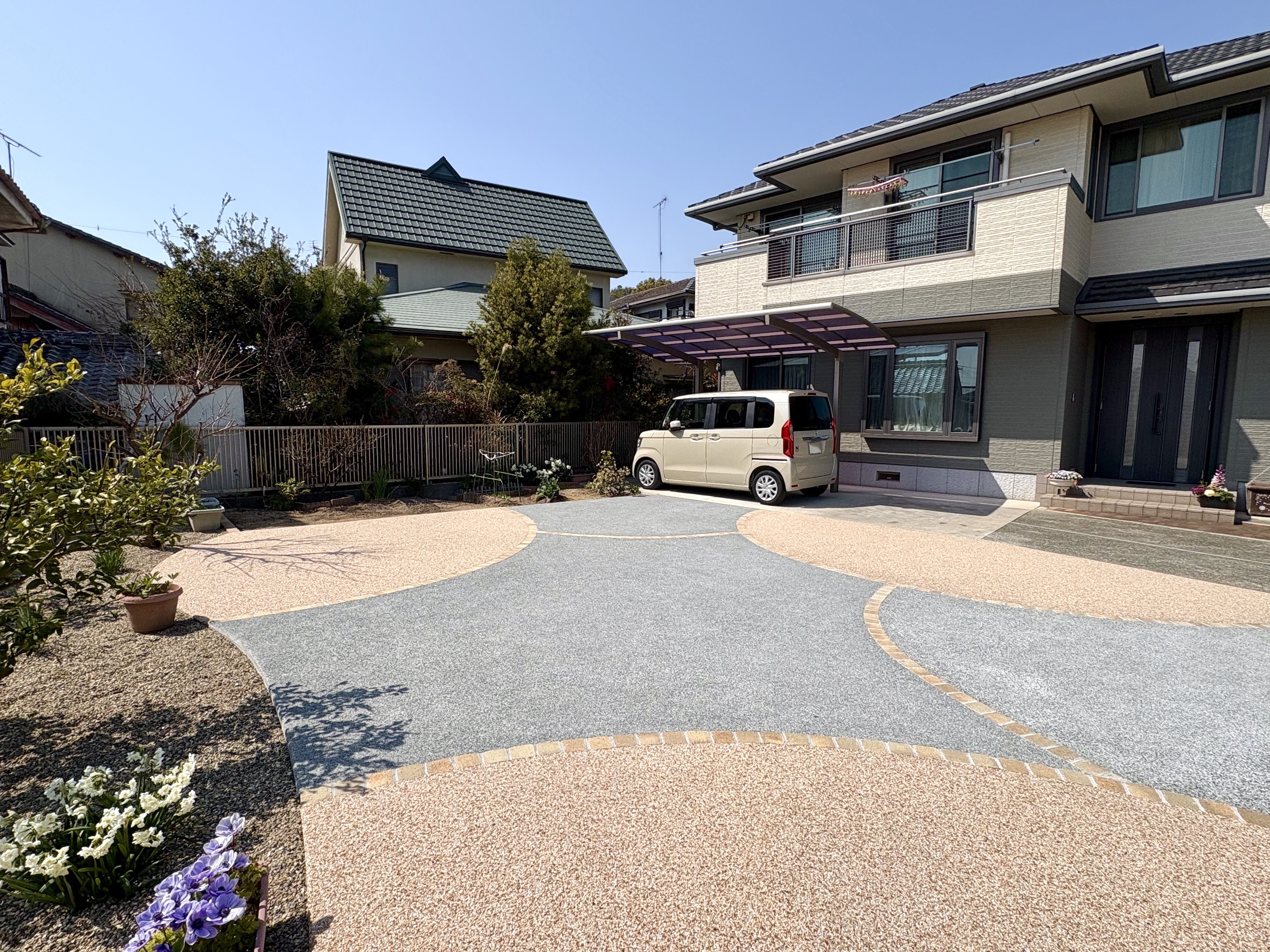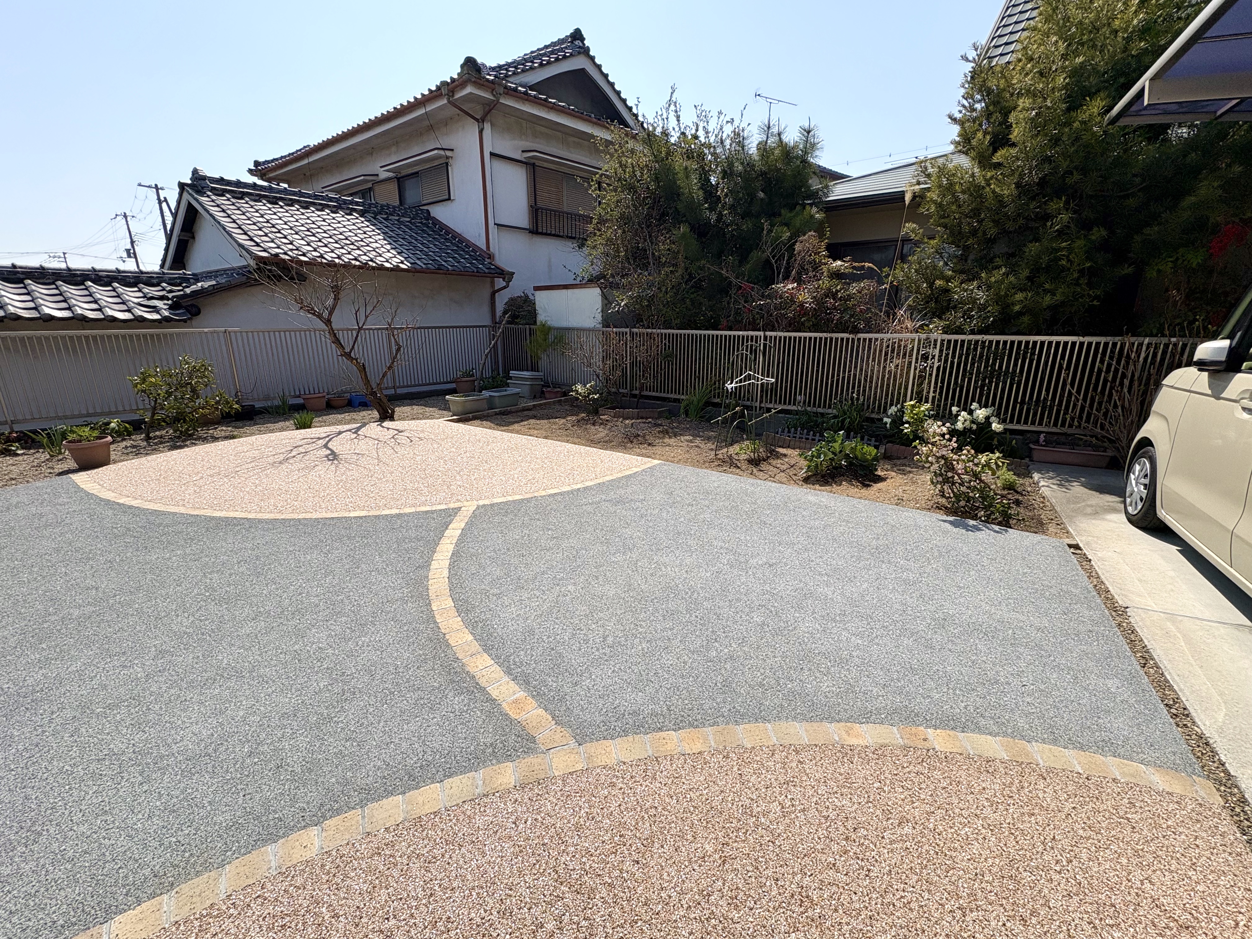 広い範囲で土と砕石だった土間部分は、コンクリート洗い出しとゆるやかな曲線デザインで樹脂洗い出し部分を作り、めりはりをつけました。樹脂洗い出しは明るめの色 リンクストーンM ニュー東雲を使うことで足元に彩りを添えています。曲線の縁と洗い出しの目地には、ソイルレンガ アンチックシルバーを使用しました。
